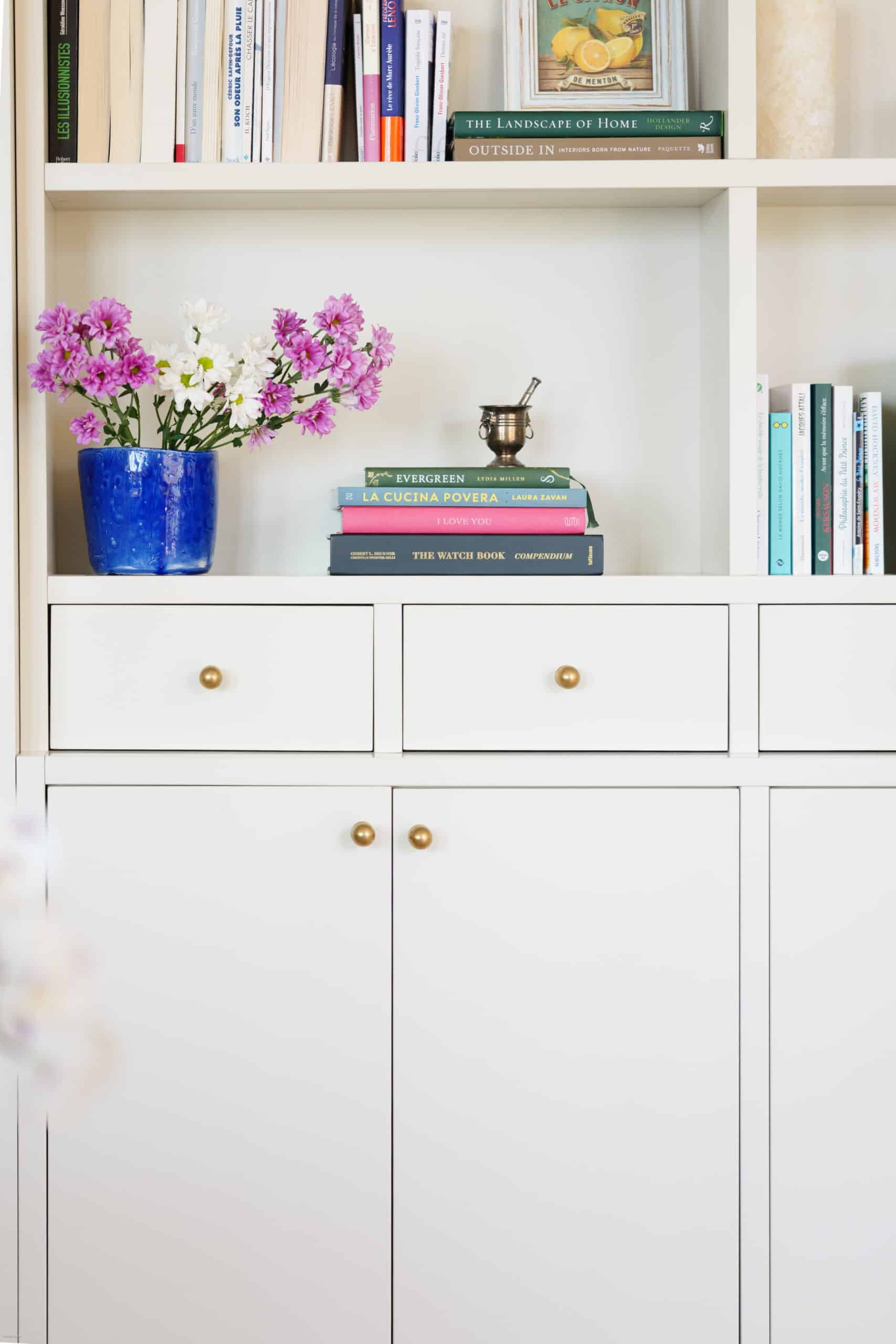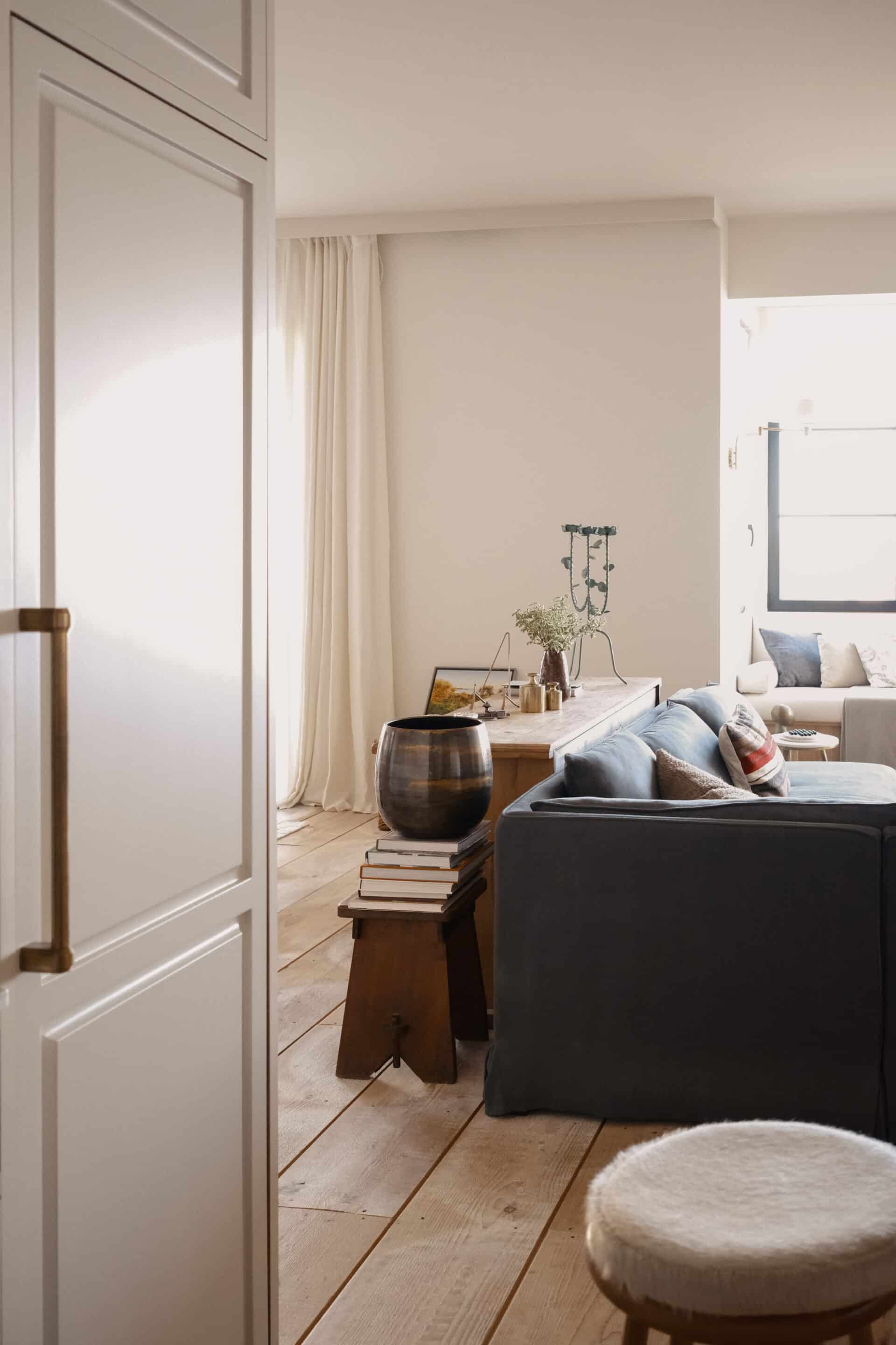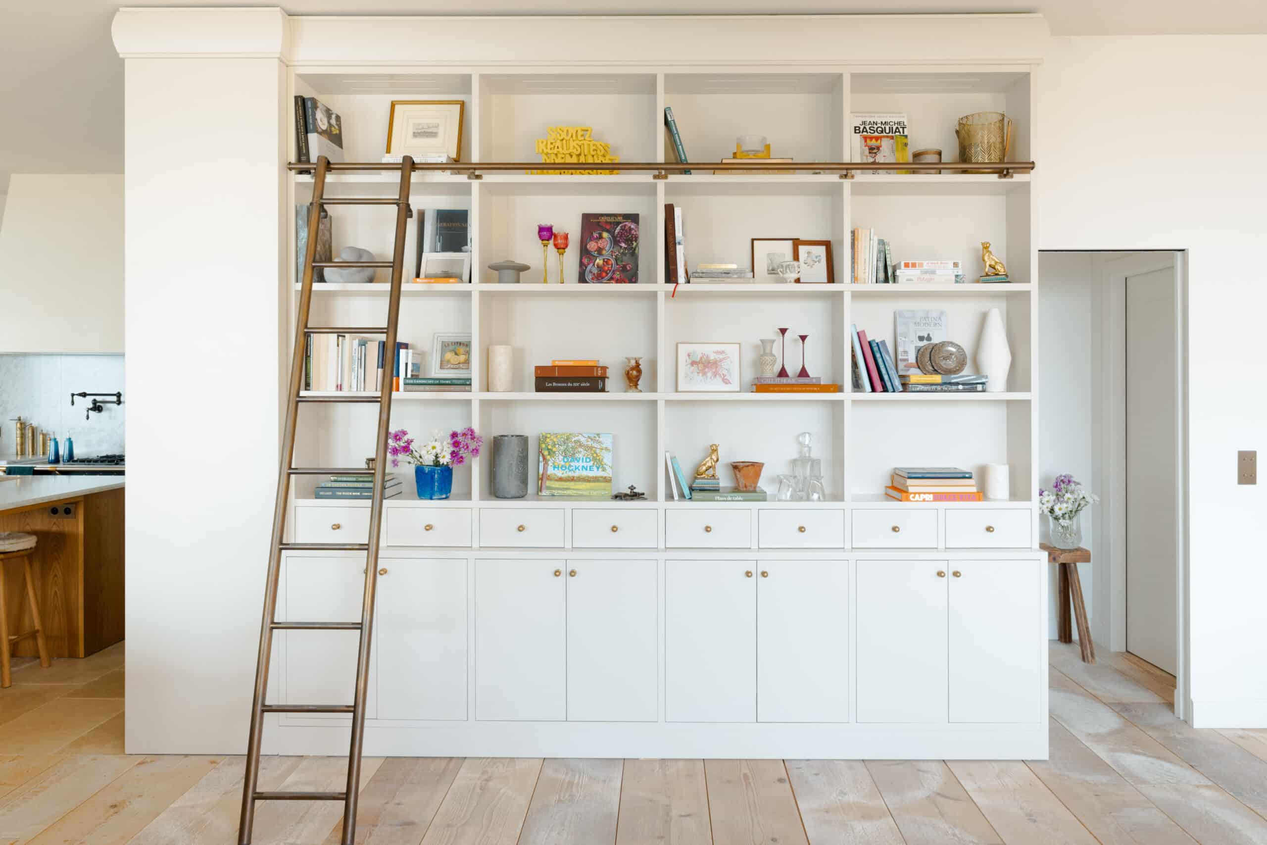 A custom-built library painted in Benjamin Moore’s Baby fawn spans the wall offering a mix of closed storage and open shelves to display collected objects and books. The library ladder adds both rustic charm and function, while its brass finish introduces a note of understated luxury. Reclaimed wood floor contrasts with creamy painted cabinetry, subtly concealing the entrance to the guest room.