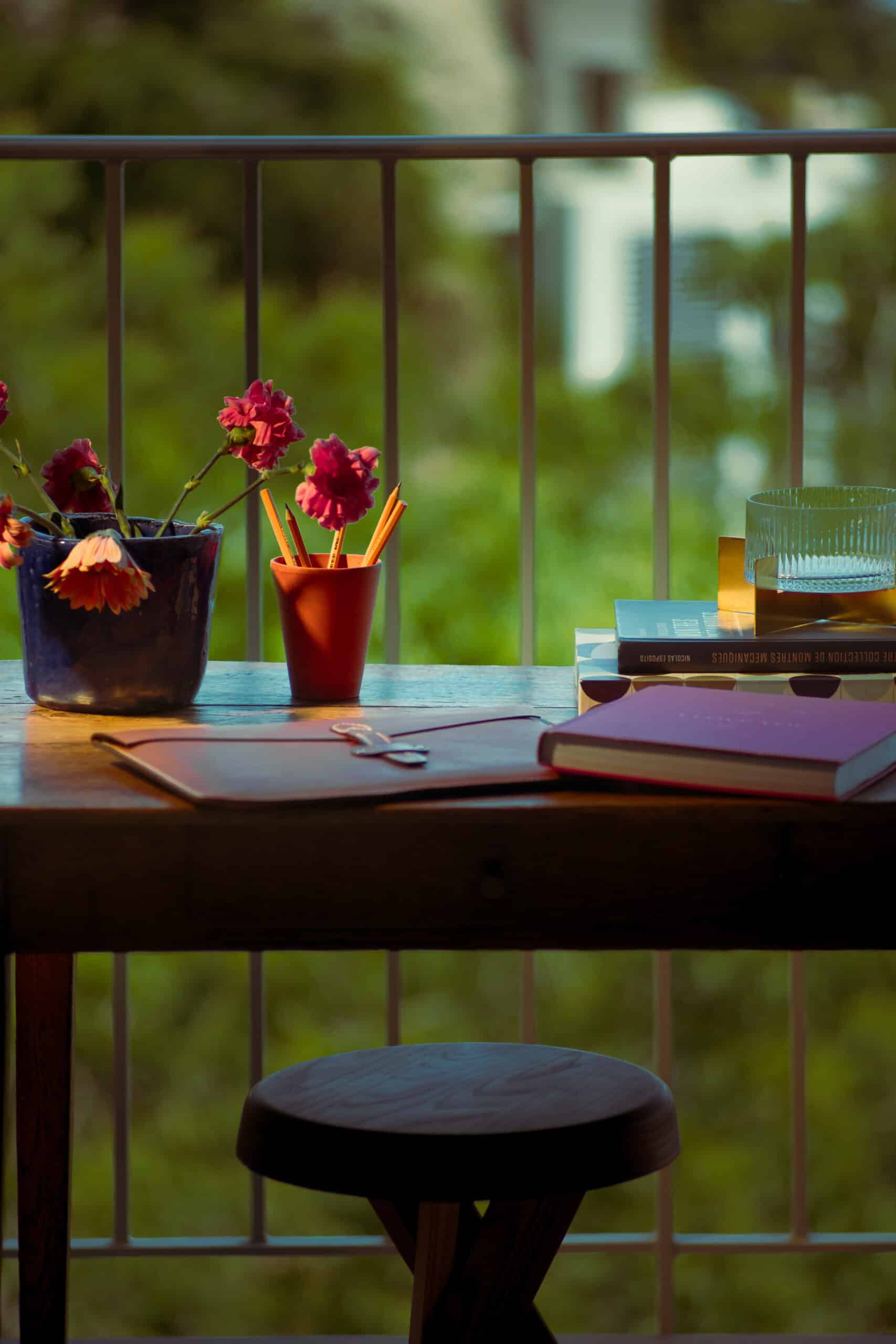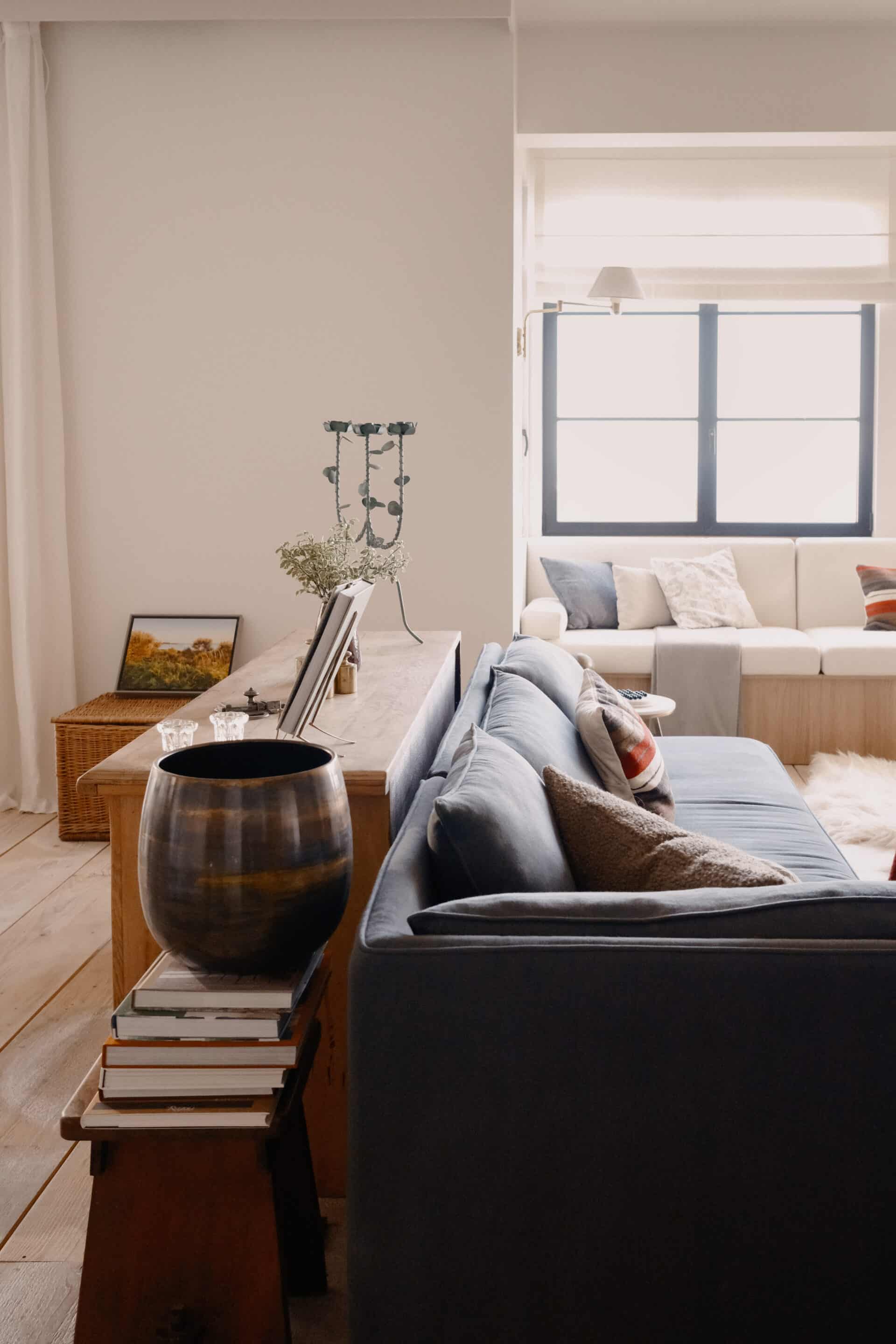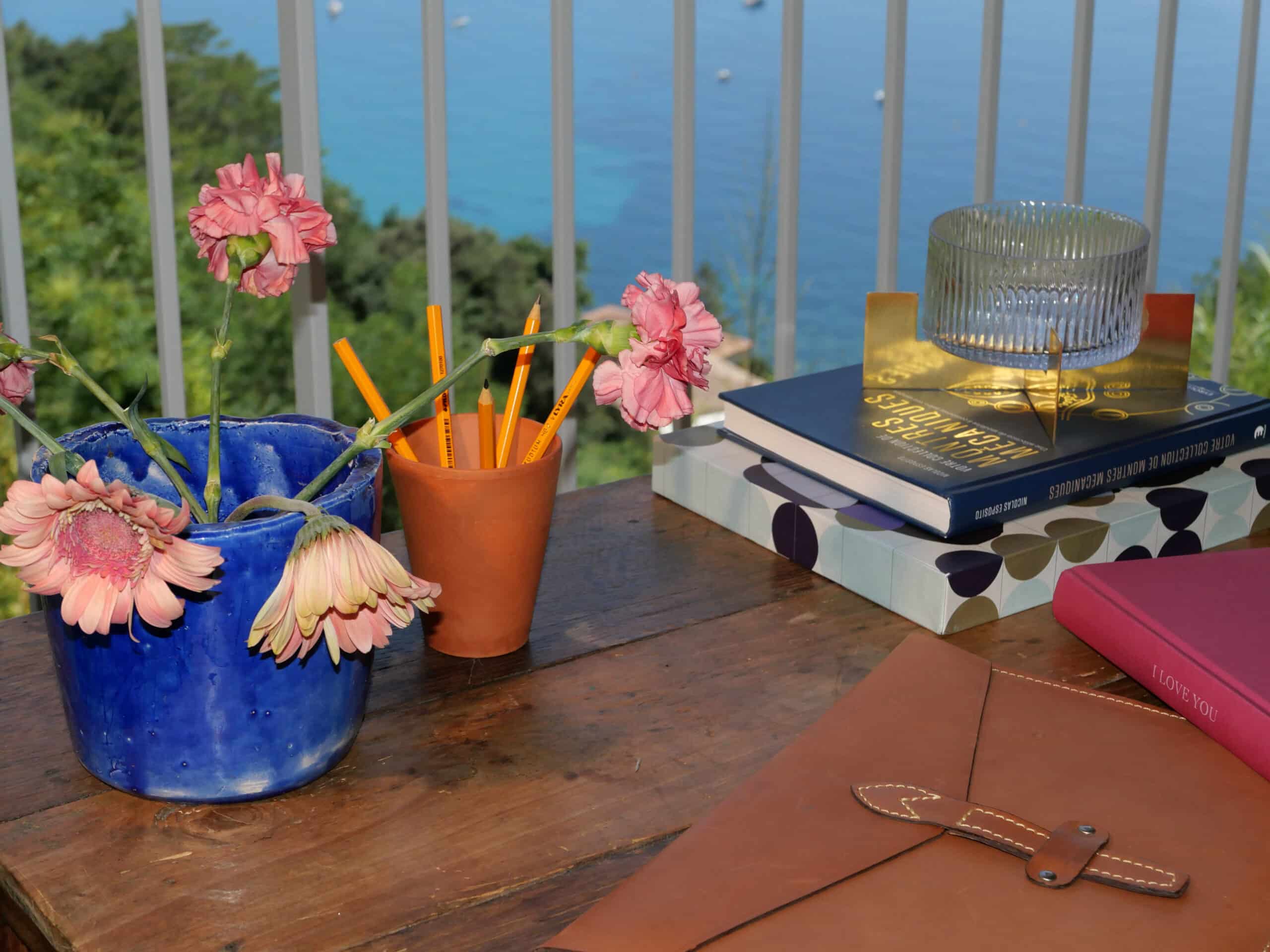 The living room was designed to function as a makeshift home office, which is why KS added a vintage french farm table, sourced through Selency, overlooking the sea. Handmade ceramics and a curated S31 crossed leg stool c1974 by Pierre Chapo complete the picture.