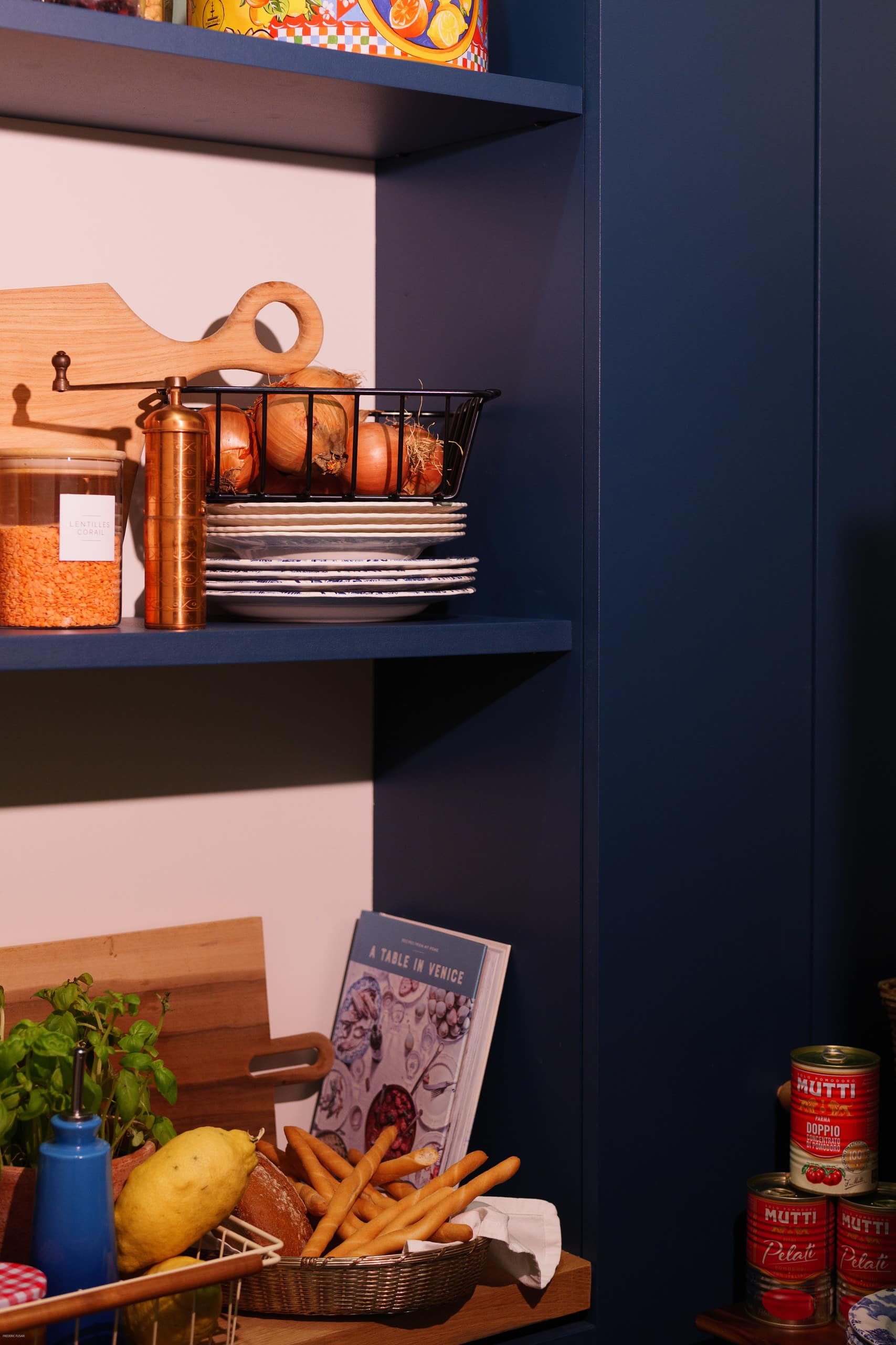 In the pantry, cabinetry painted in Benjamin Moore Gentleman’s grey adds a dramatic touch. The rich, moody blue palette and thoughtful details give the space a rustic yet sophisticated feel—making it a crowd favorite.