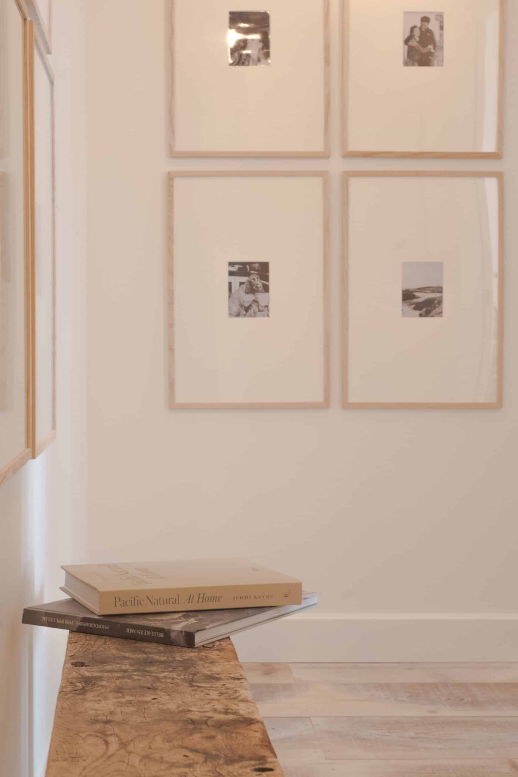 Leading to the guest room, an eclectic gallery wall lines the hallway, softly illuminated by flush mounts and picture lights from Mullan Lighting. The oak-paneled ceiling continues the warmth of the wood-clad entryway, while a vintage oak carpenter’s bench adds purpose and character to the space.