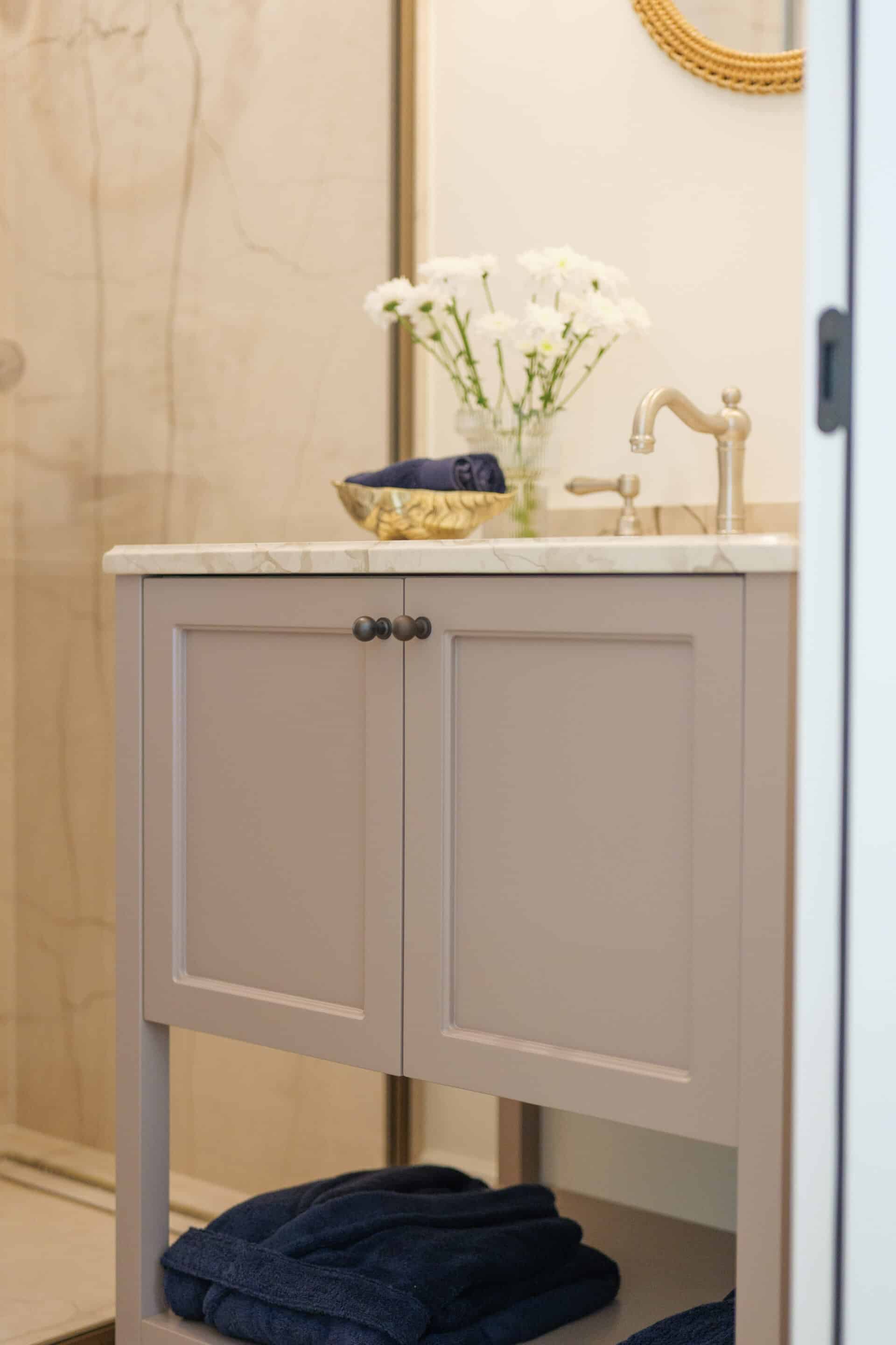 Bath linens from the luxurious Italian brand Frette, renowned for exquisite craftsmanship, elevate the bathroom experience. The Benjamin Moore Driftwood vanity echoes the bedding tones in the adjacent guest bedroom for a cohesive, serene palette.