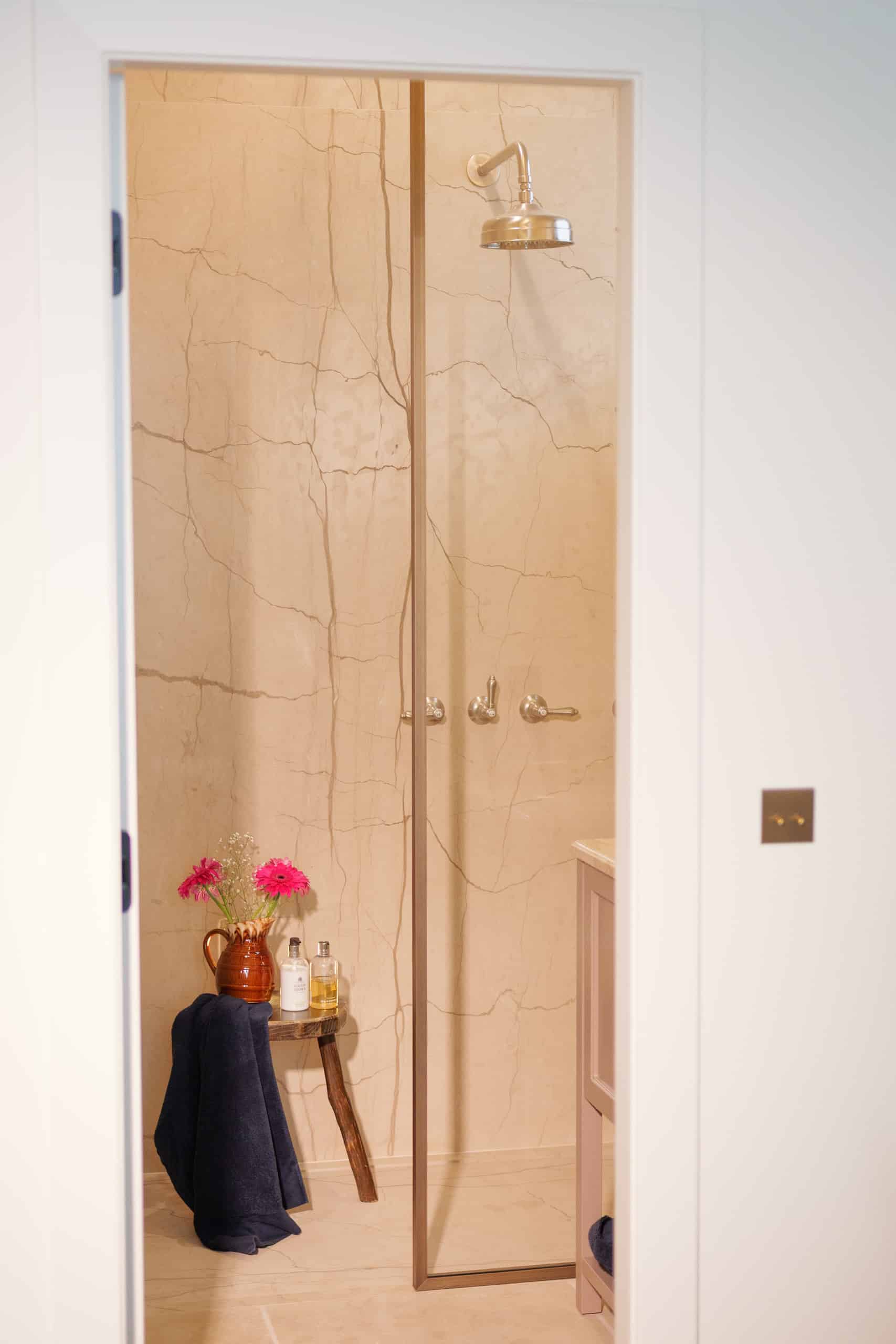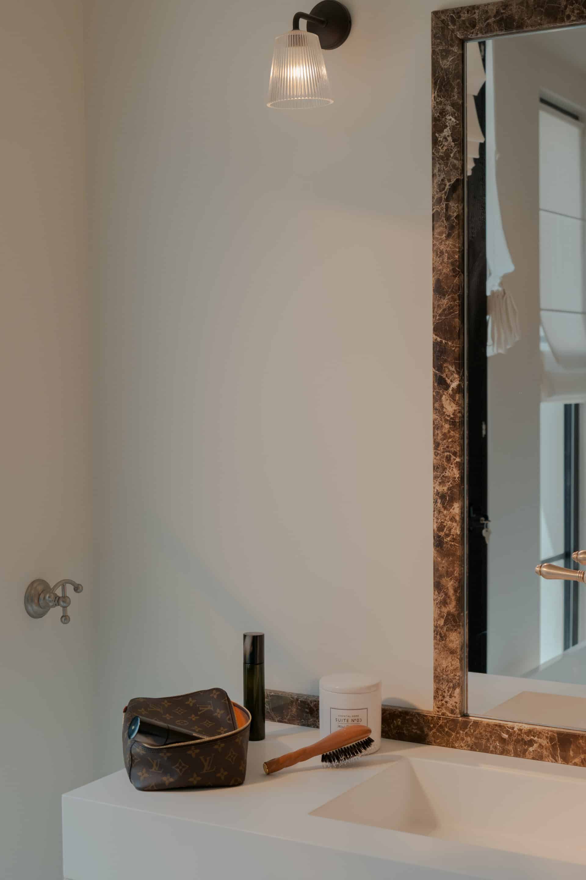 The en-suite bathroom highlights expert craftsmanship, with flutter-detailed cabinetry painted in Benjamin Moore Wenge and a powder marble vanity top veined in brown. Dark bronze knobs from Corston Architectural Design, paired with unpolished silver Officina Nicolazzi faucet and vintage brass barber mirror complete the curated, sophisticated look. A sconce from Mullan Lighting adds a classic touch to the space.