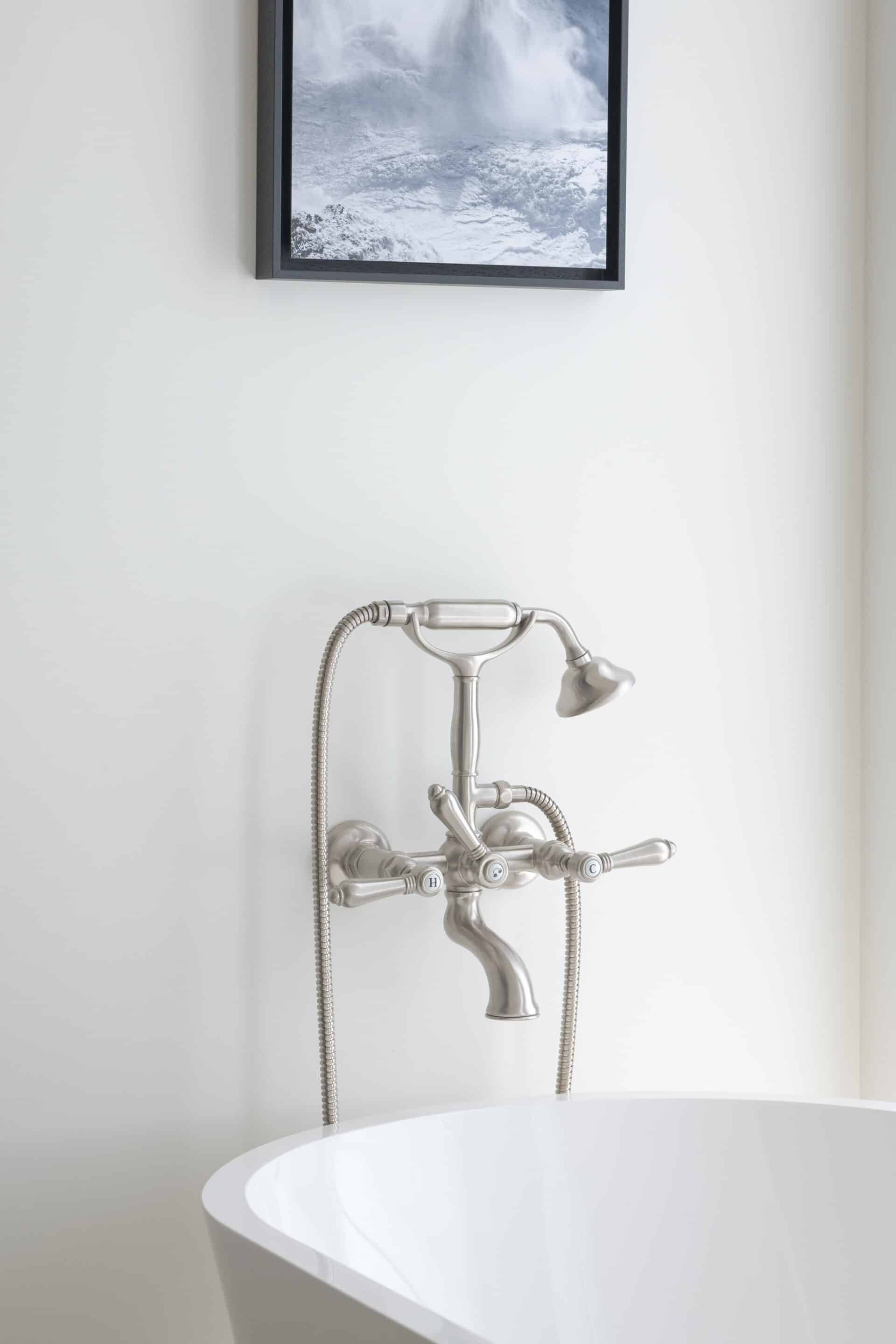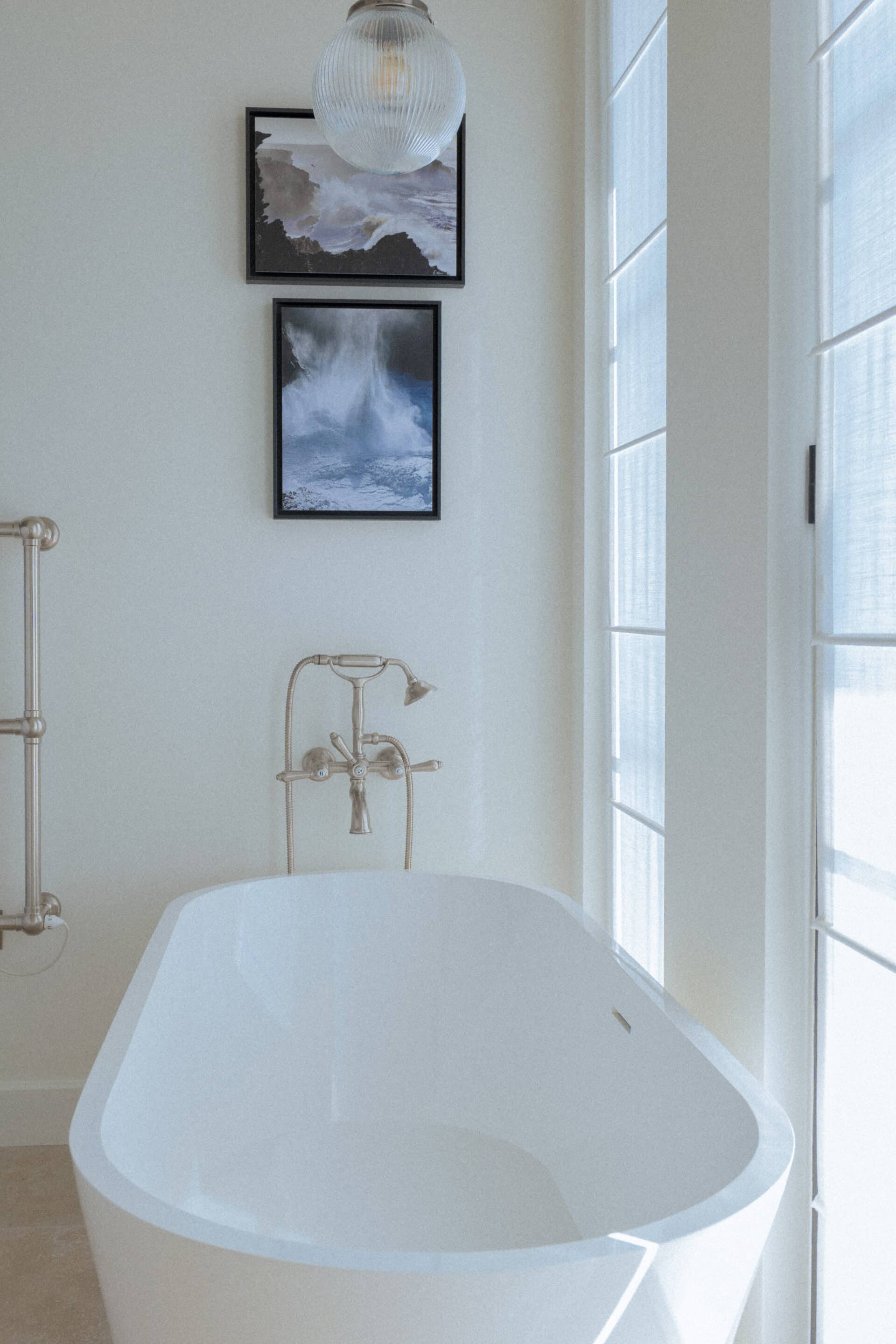 A freestanding bathtub by THG Paris, paired with an unpolished silver bathtub set from Officina Nicolazzi , enhances the bathroom design with elegance and prestige; styled with artwork to create a serene, spa-like moment.