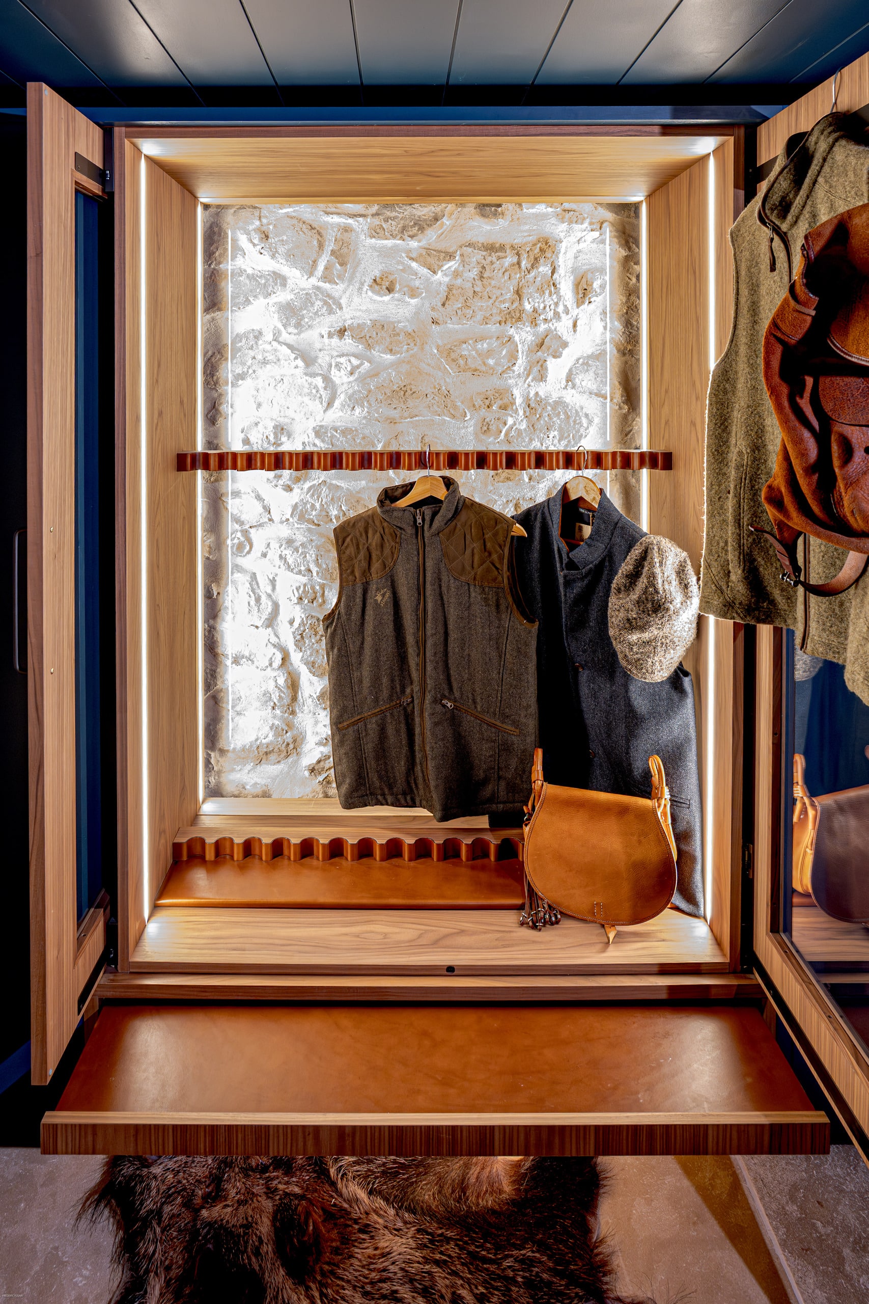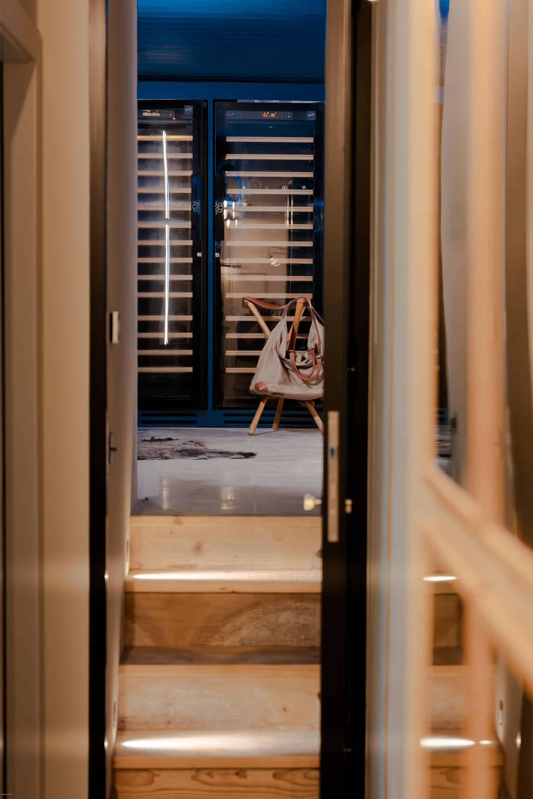 Immersed in deep blue, the Gentleman’s Room evokes the moody allure of an old-world lounge. Bespoke American walnut cabinetry with bronze-cast hardware and limestone flooring set an immersive backdrop, layered with velvet, leather, wool, and vintage accents. Raw, uncovered stone walls provide a striking counterpoint to the refined finishes, introducing a balance of organic texture and sophistication. Professional wine coolers, seamlessly integrated into the cabinetry, underscore the room’s masculine character and complete its gentlemanly atmosphere.