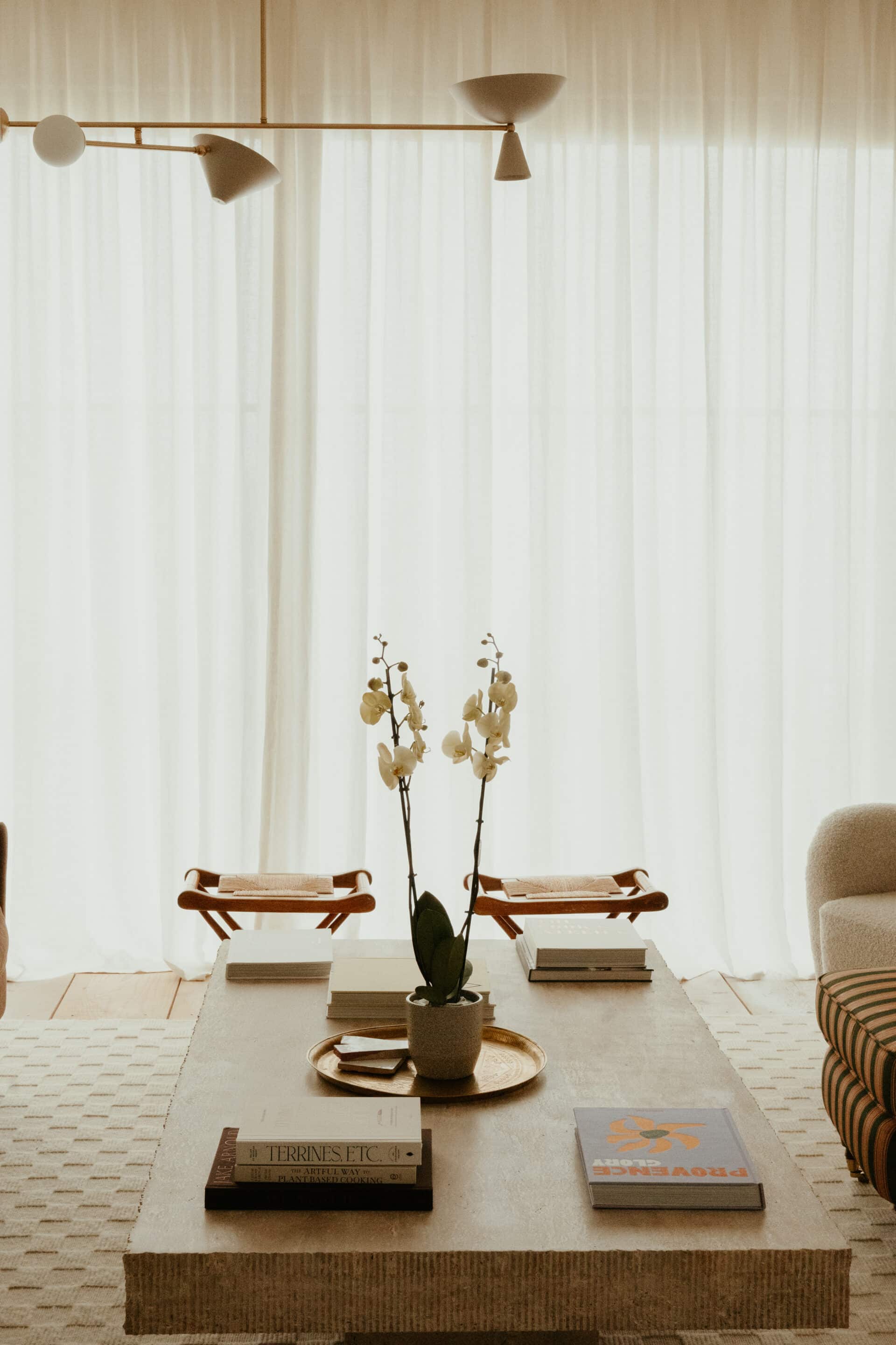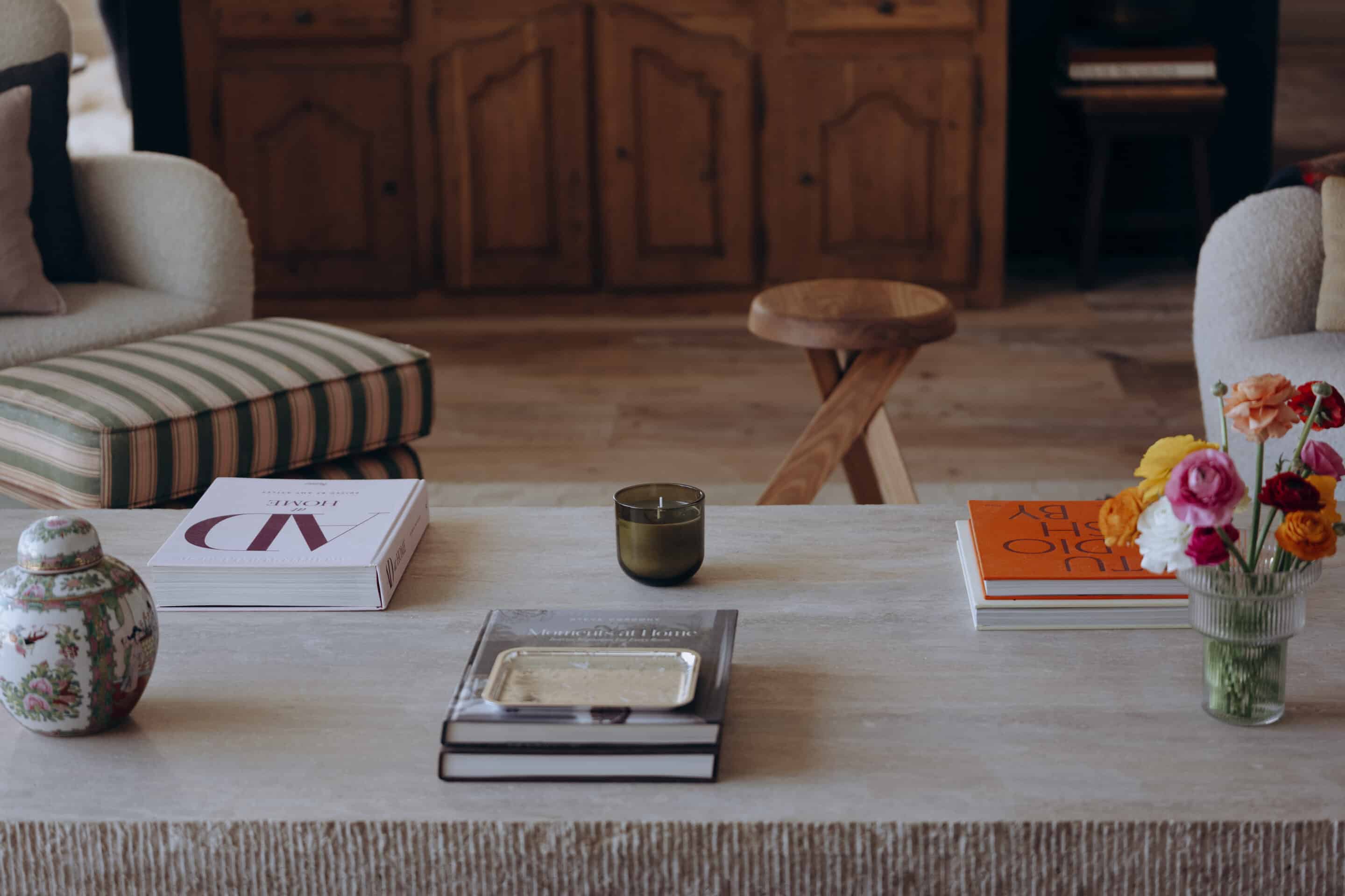 A KS Studio Design sofa with brushed-brass legs (launching fall 2026) pairs with custom Danish-inspired wingback armchairs in the conversational living room. Overhead, a vintage Swedish chandelier from 1stDibs illuminates a custom travertine coffee table, flanked by vintage stools and a rare French mid century wooden tripod S31 stool in solid elm by Pierre Chapo repurposed as a side table. A textured rug by Vincent Van Duysen for Zara Home grounds the composition.