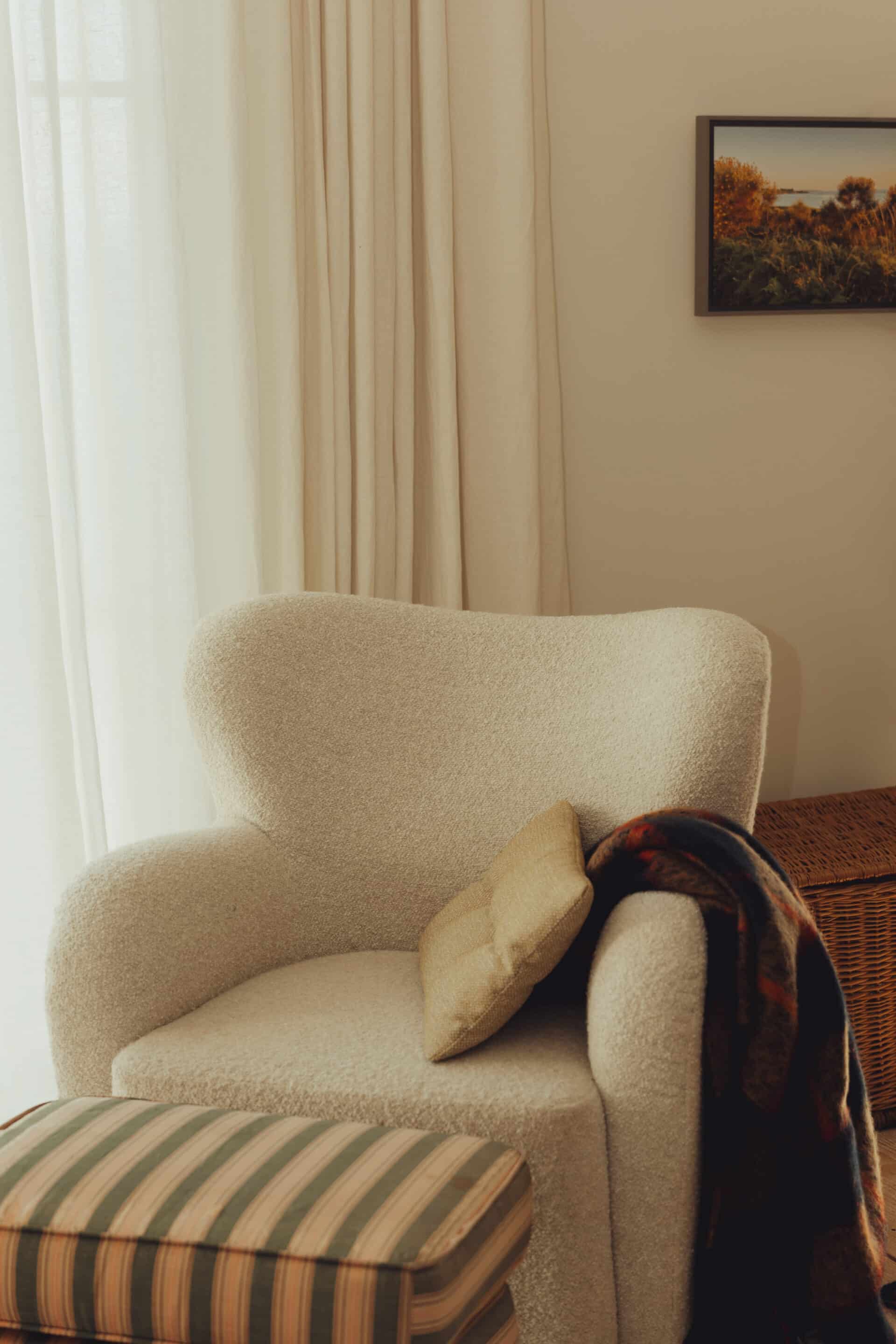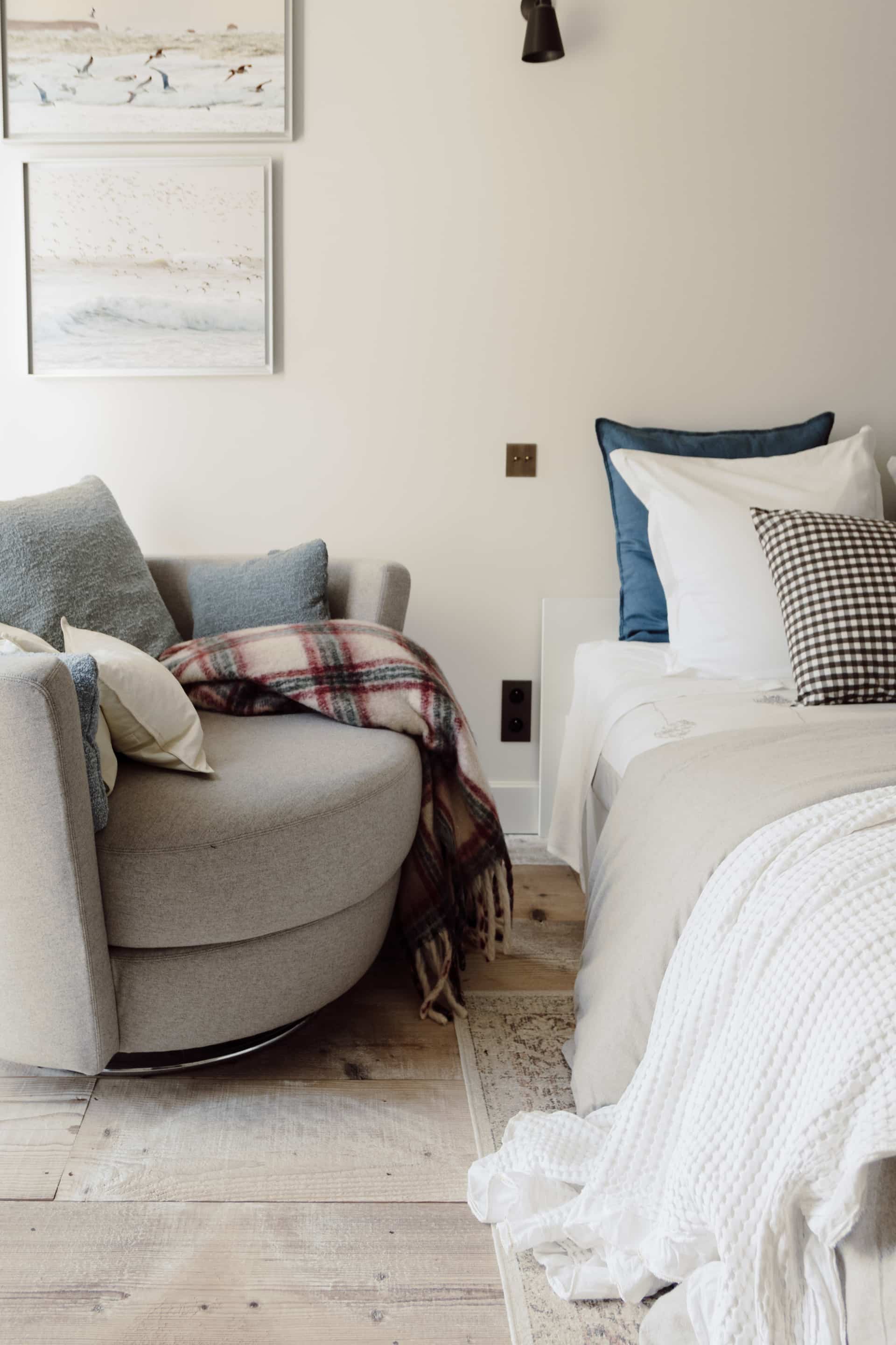 In the guest bedroom, a bespoke swivel-round armchair, has a base upholstered in light grey Kvadrat wool fabric mimicking the color of beach pebbles from the surrounding landscape. The bedroom features the Apparatus cloud ceiling pendant with a blackened brass accent creating interest above the bed. Curated a cozy bedroom look with Zara Home, perfect for fall and all year round.