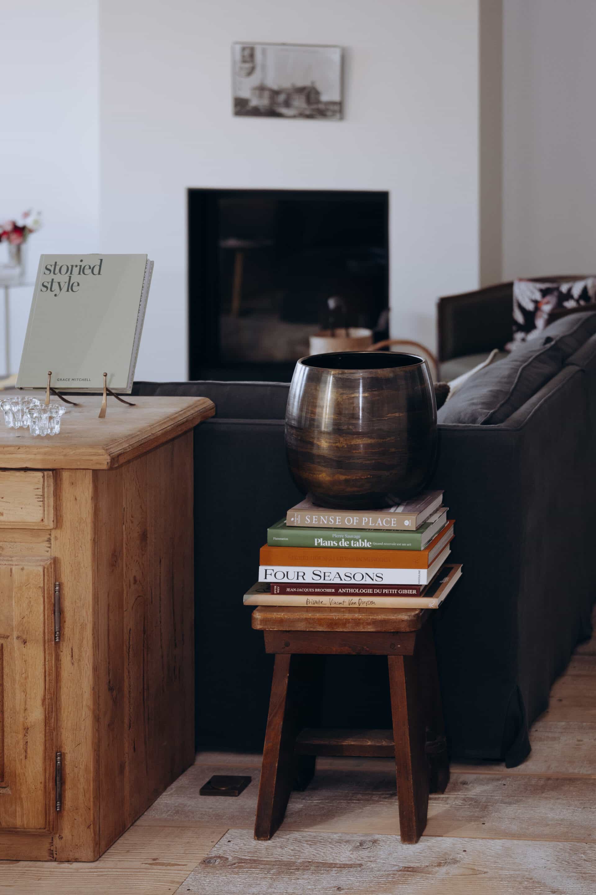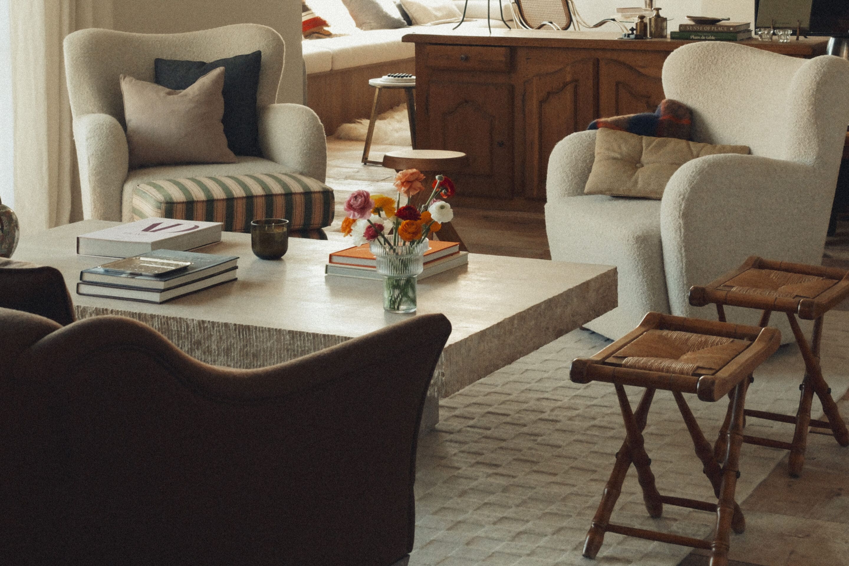 In the formal living room, a cashmere flannel sofa pairs with curly sheepskin armchairs and vintage stools, offering the perfect sanctuary for intimate gatherings.
