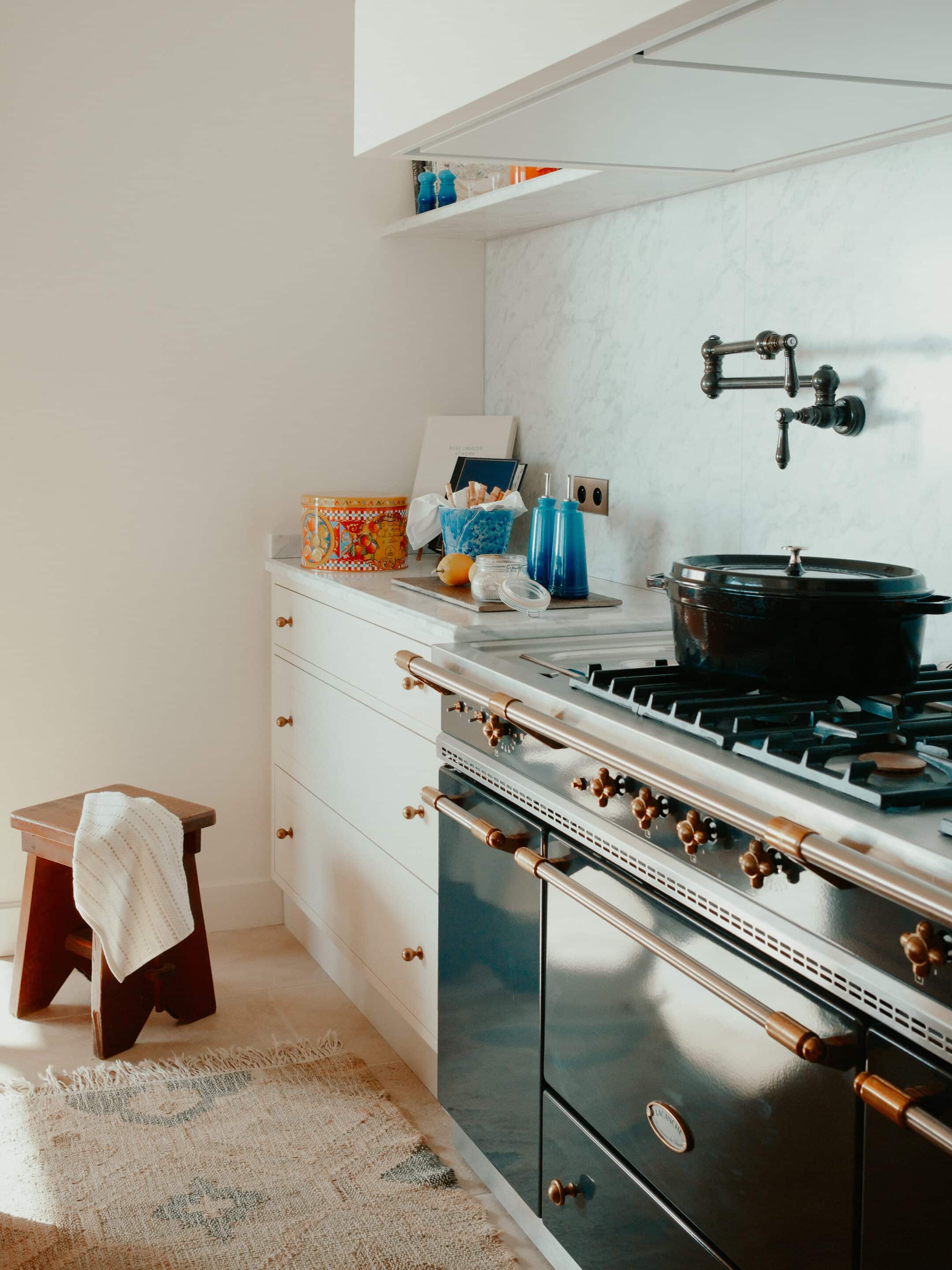 Breakfast station with Le Creuset mugs, moka cups, and teapots, espresso cup from Vincent Van Duysen for Serax. Italian brand Officina Nicolazzi faucet in bronze finish brings refined details.