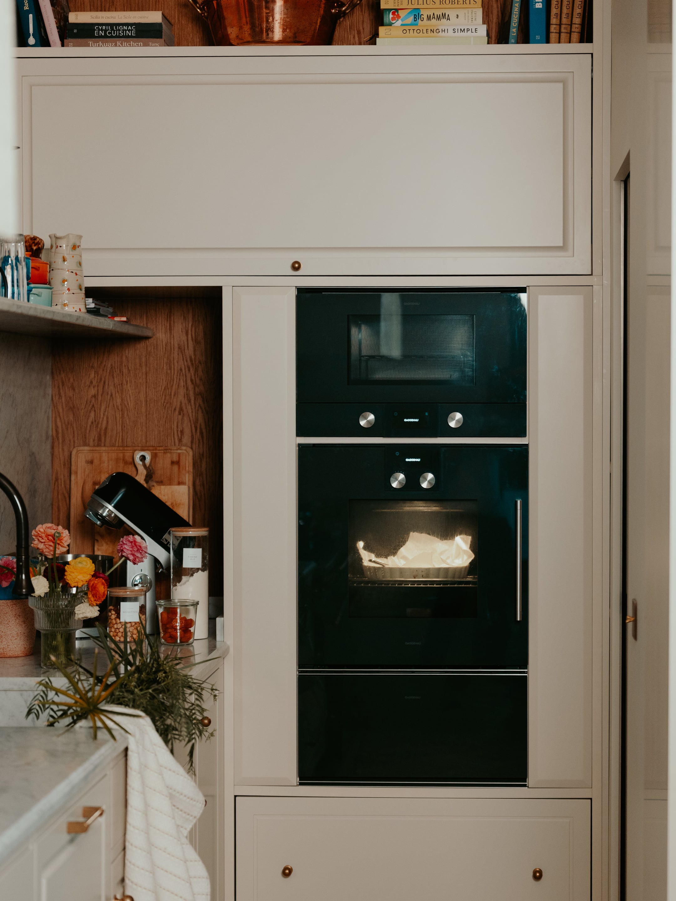 Breakfast station with Le Creuset mugs, moka cups, and teapots, espresso cup from Vincent Van Duysen for Serax, ceramic canisters, cookbooks, and an Italian Moka coffee machine by Bialetti. Italian brand Officina Nicolazzi faucet in bronze finish brings refined details. An eclectic ensemble of treasures on the marble floating shelf glows under vintage 1970s German brass sconces from 1stDibs.