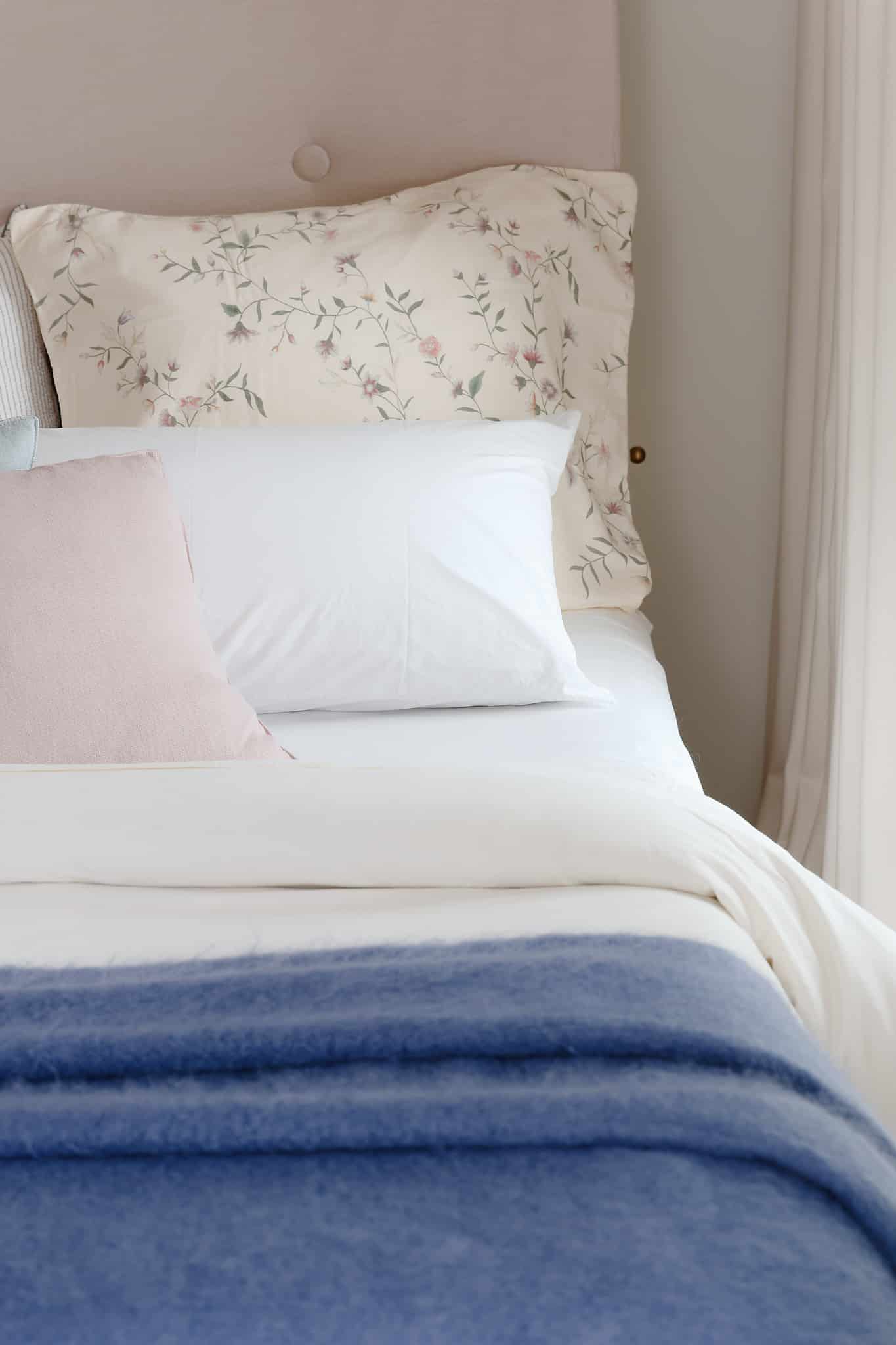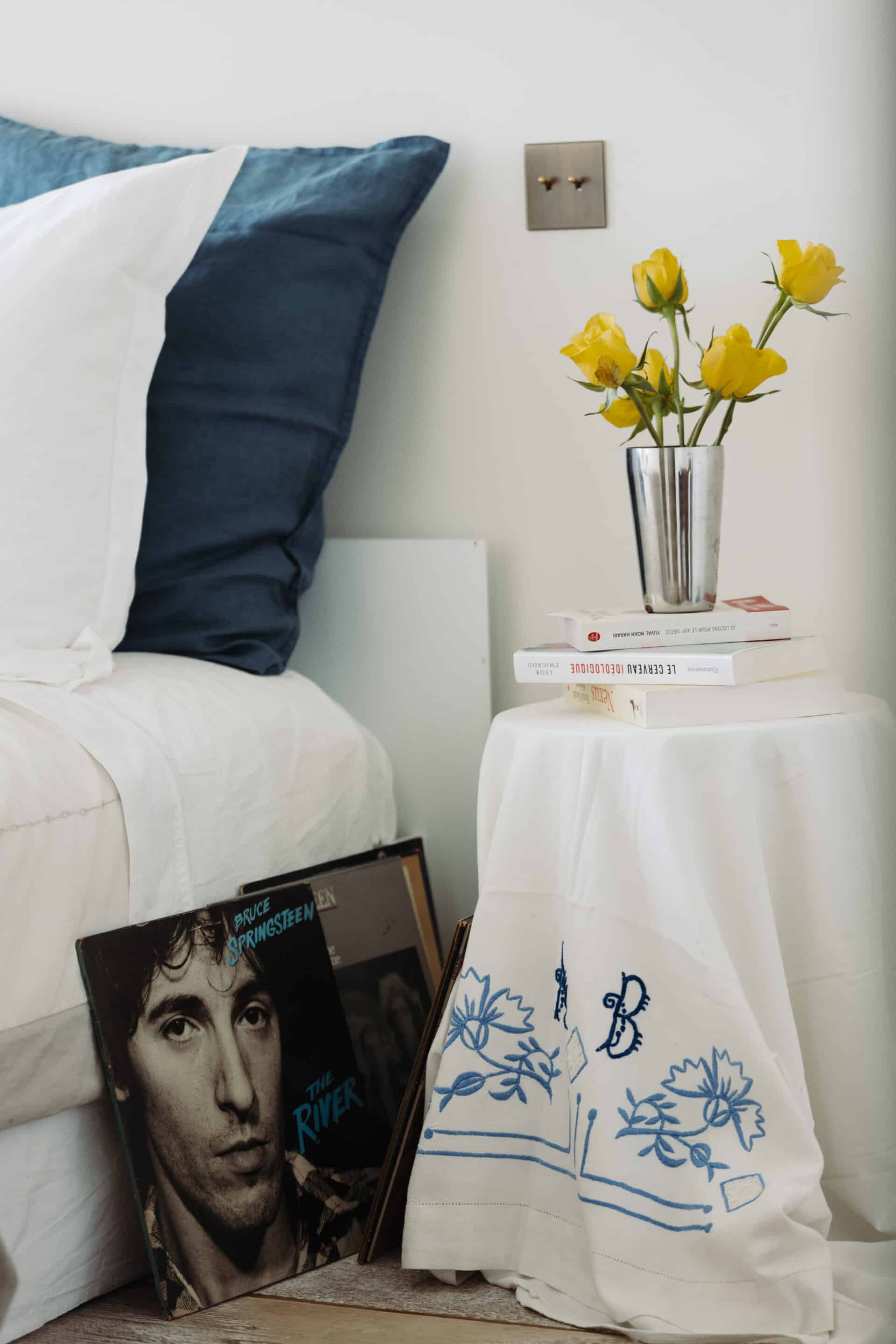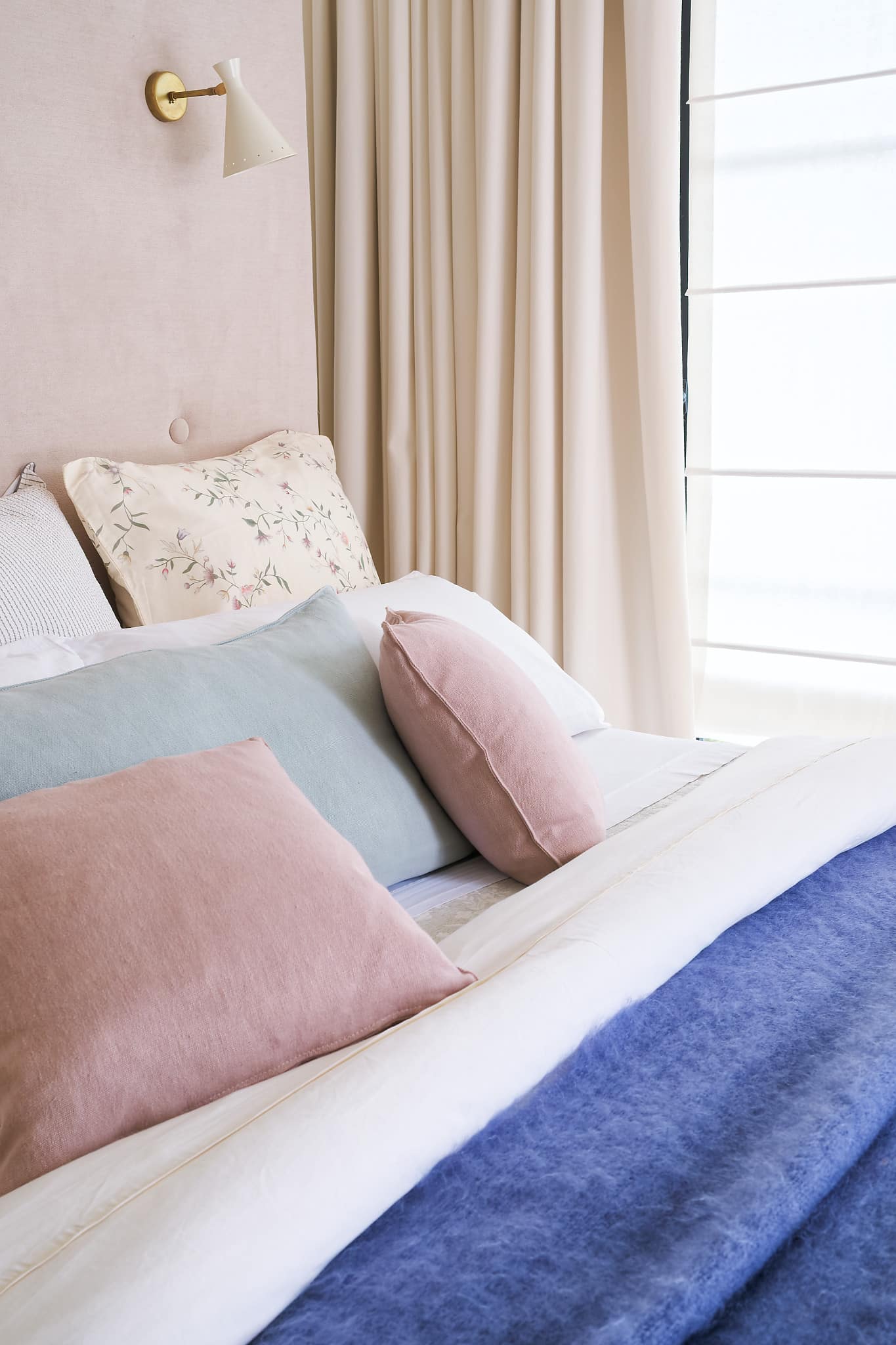 In keeping with the rest of the house, a quiet and serene second guest room with the same mix of vintage and custom designs. A bespoke dark blue bouclé bed and headboard by KS Studio Design is paired with orignal Regain side tables. The bespoke headboard fits the width of the room perfectly.