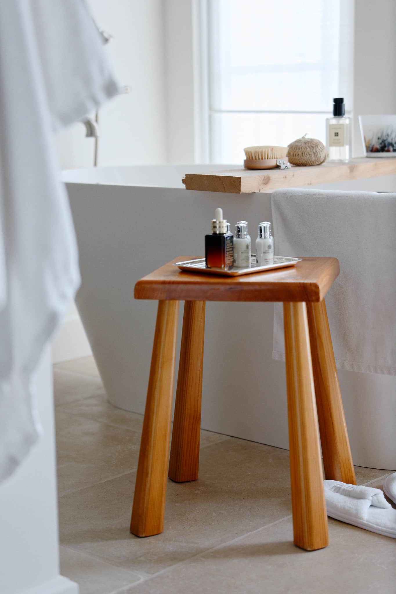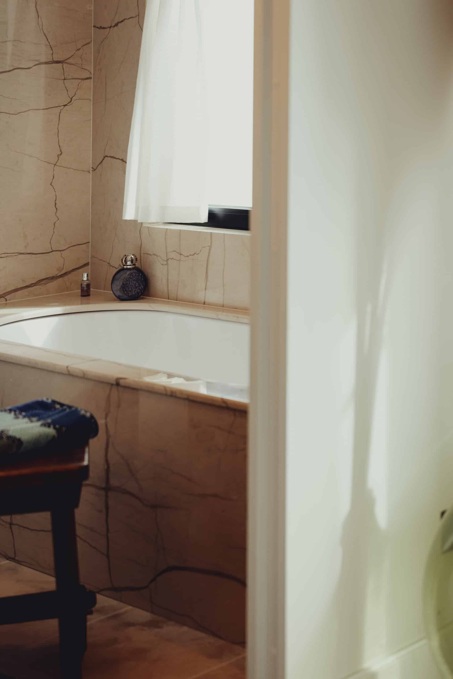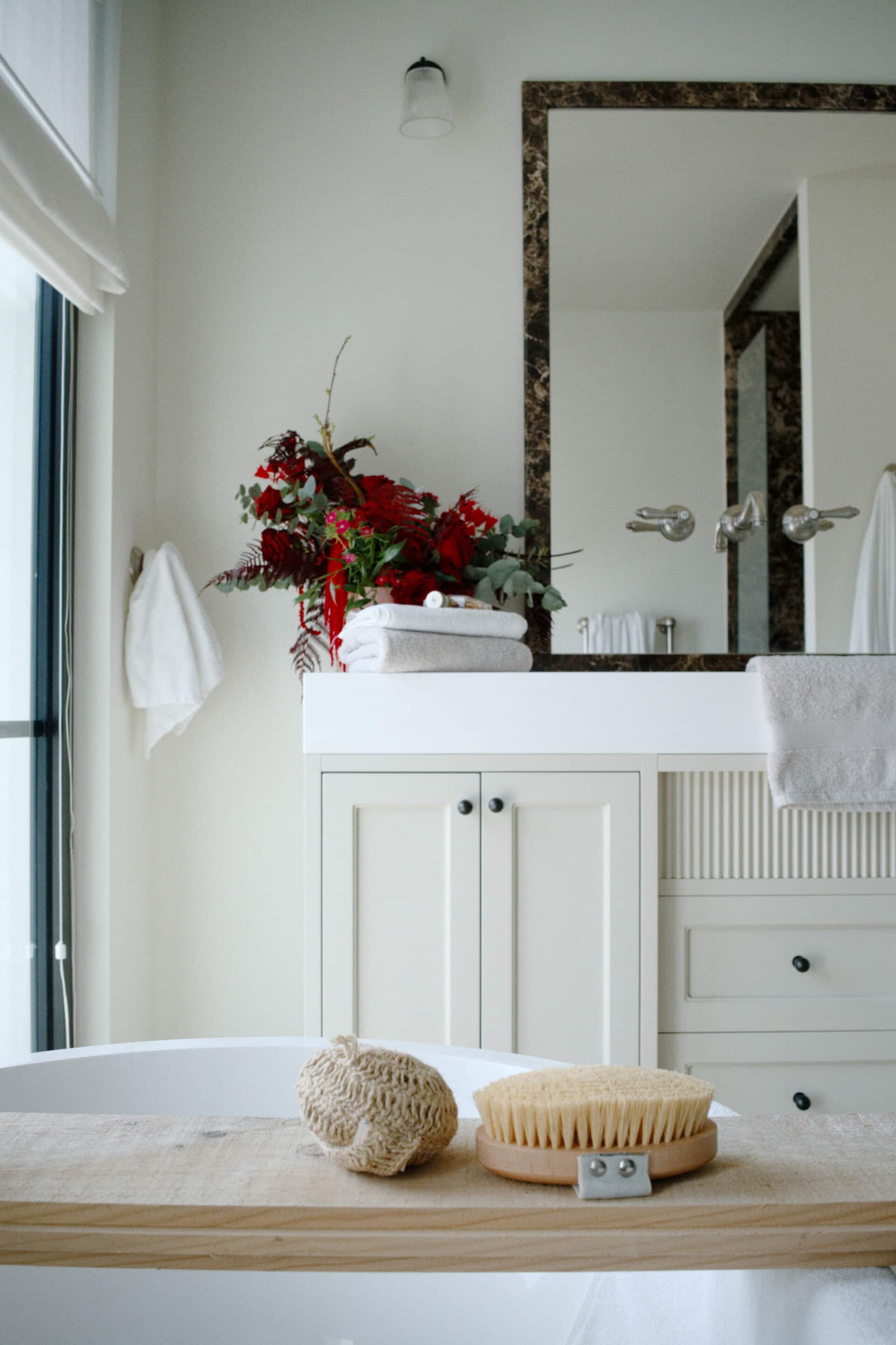 The primary bathroom embodies refined simplicity, with a custom stone sink, integrated storage, and a palette of light. A marble-trimmed vanity mirror with sconces reflects the bathtub, while a pendant light from Mullan Lighting hangs overhead. Seasonal greenery and a Baobab candle add a signature fragrance, and crisp white Frette bath linens elevate the experience.