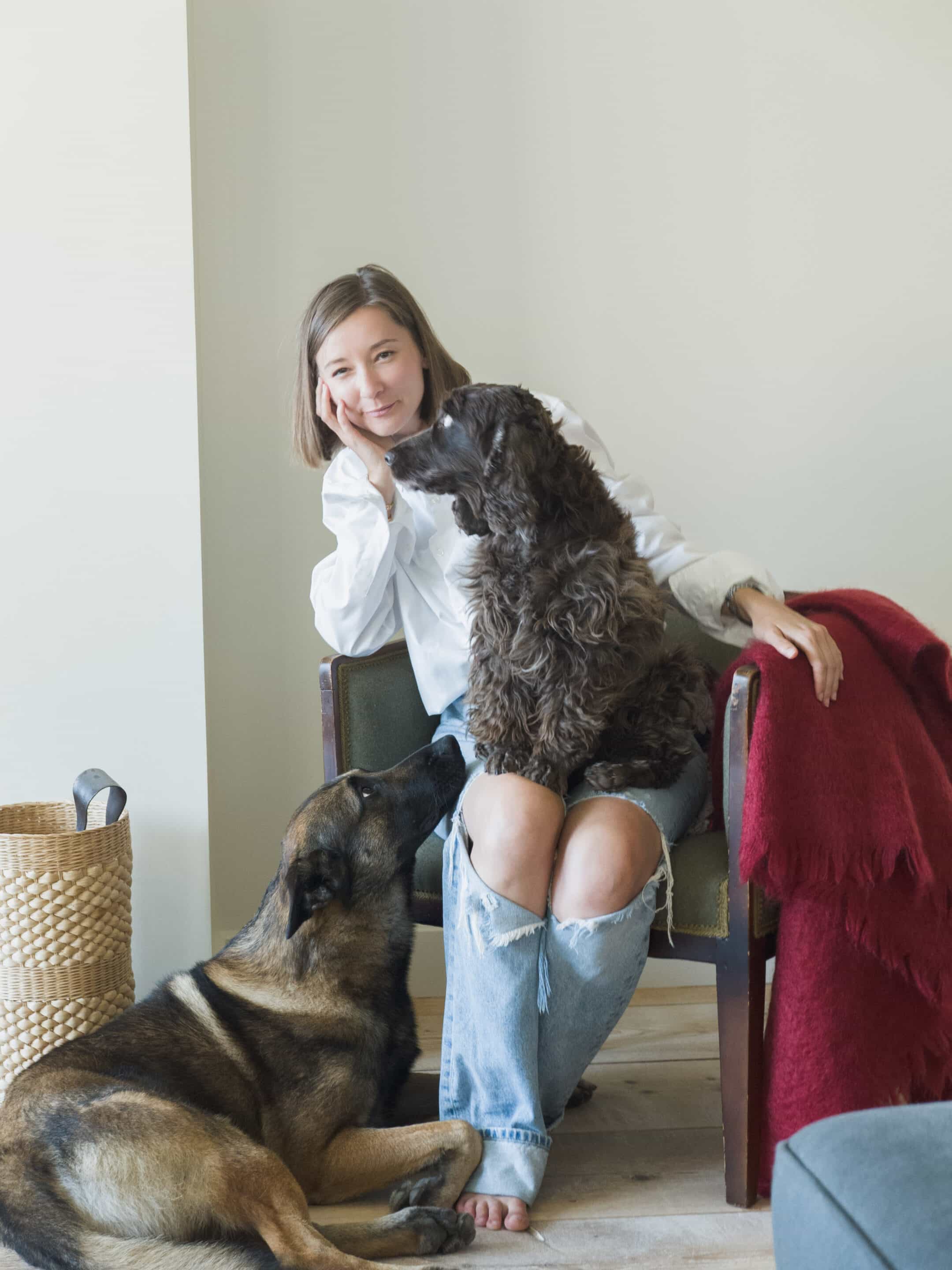 KS and her  2 dogs, Riva an English cocker and Shadow a German shepherd,  in the great room.