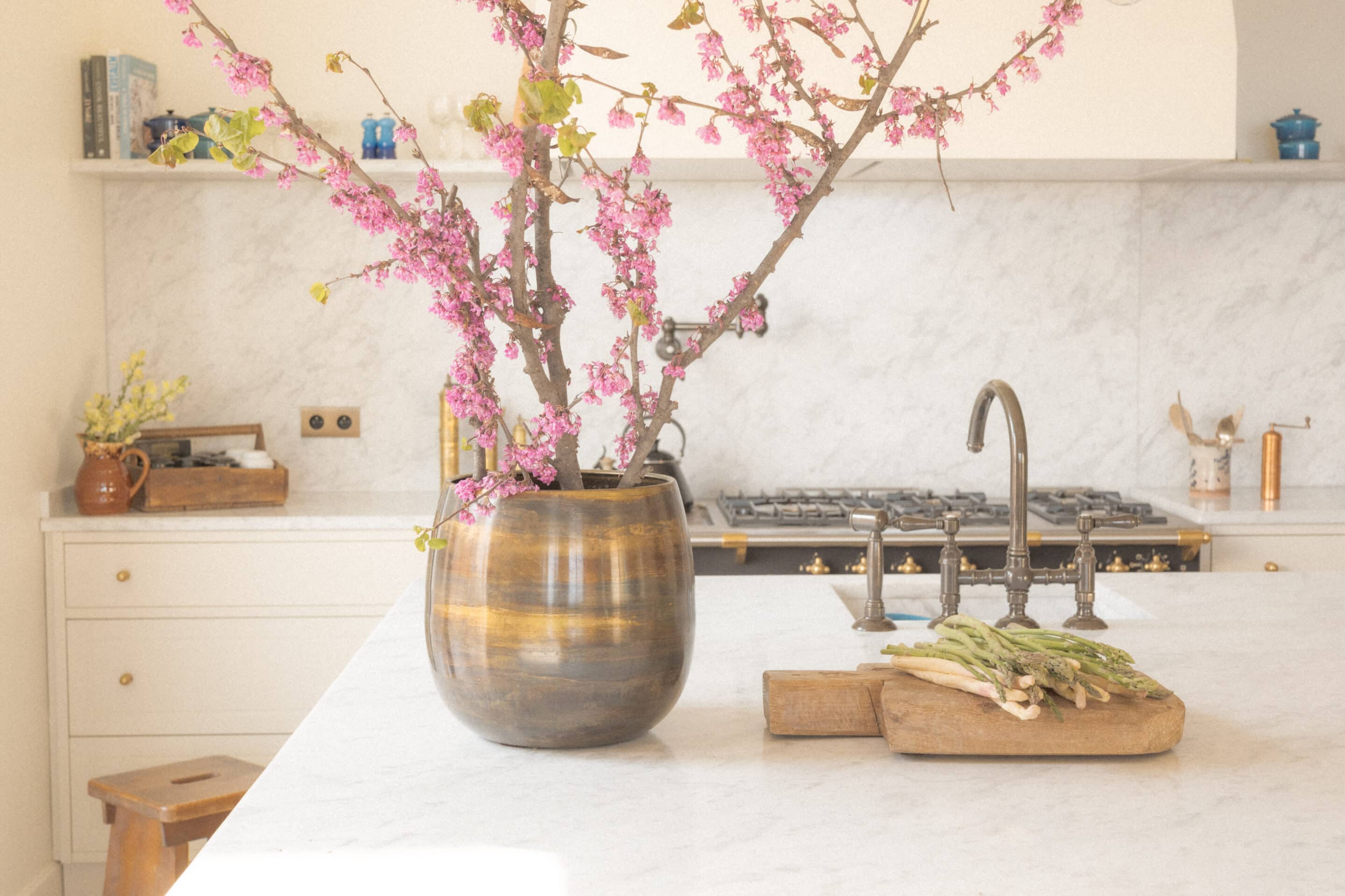 The kitchen has been elevated with white Carrara marble countertops and half-height backsplash as a place to both prepare meal and to entertain. ” People always worry about marble staining, but you must let marble develop, patina, and become part of the story “, KS shares.