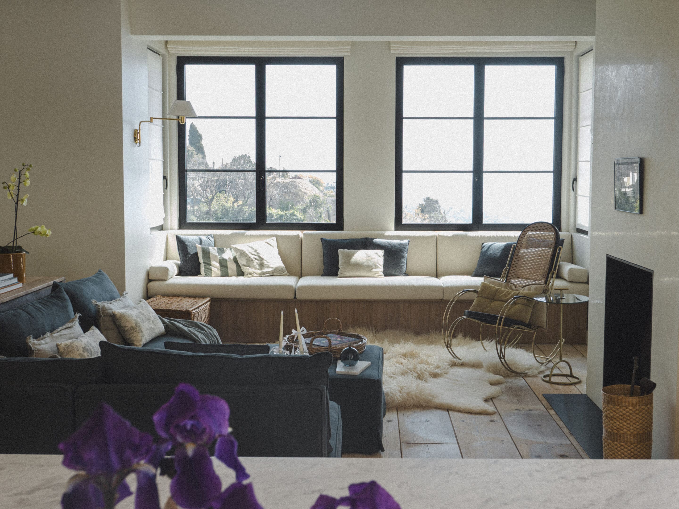 The textured stucco on the fireplace wall brings a lot of warmth. ” What’s nice is when walls absorb and reflect light in different ways “, KS shares.