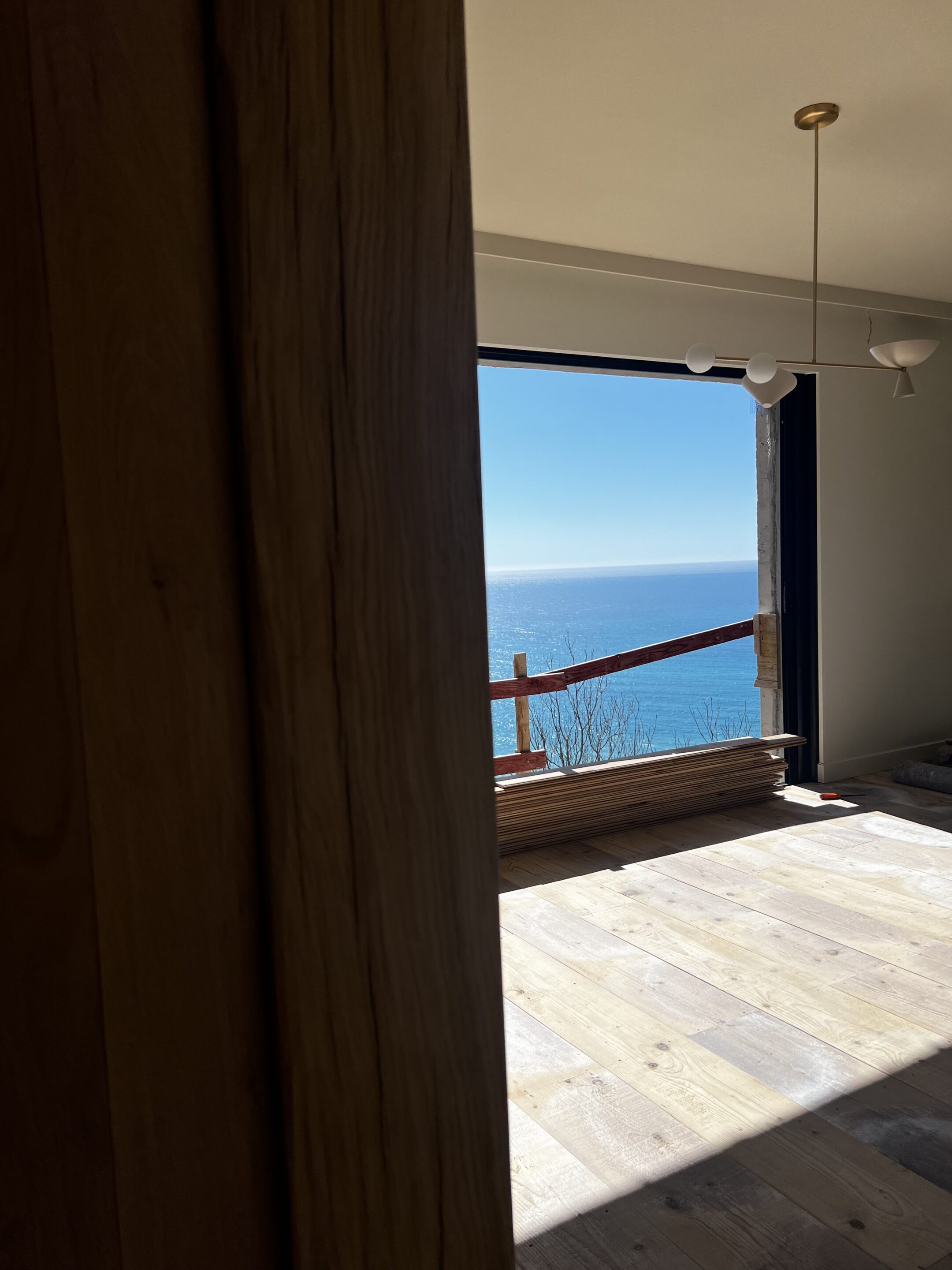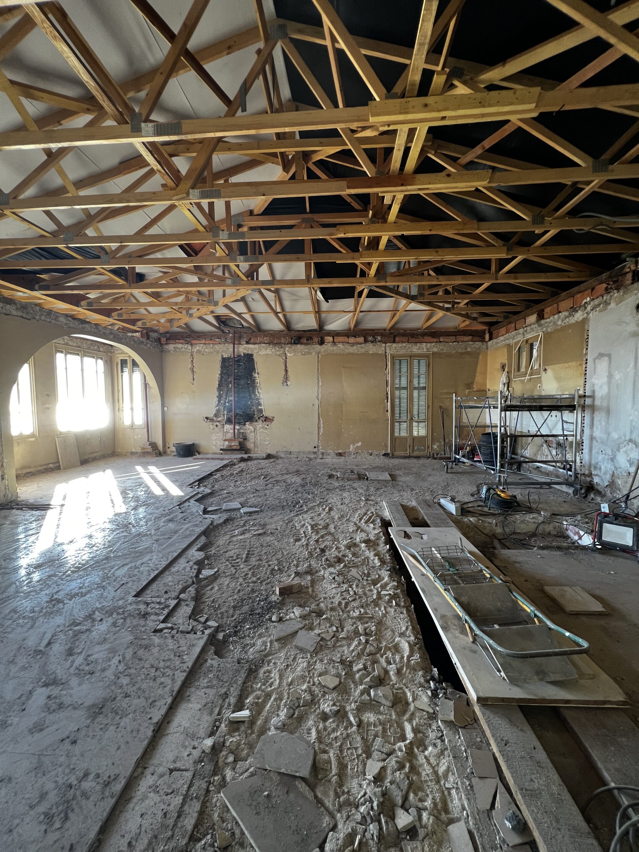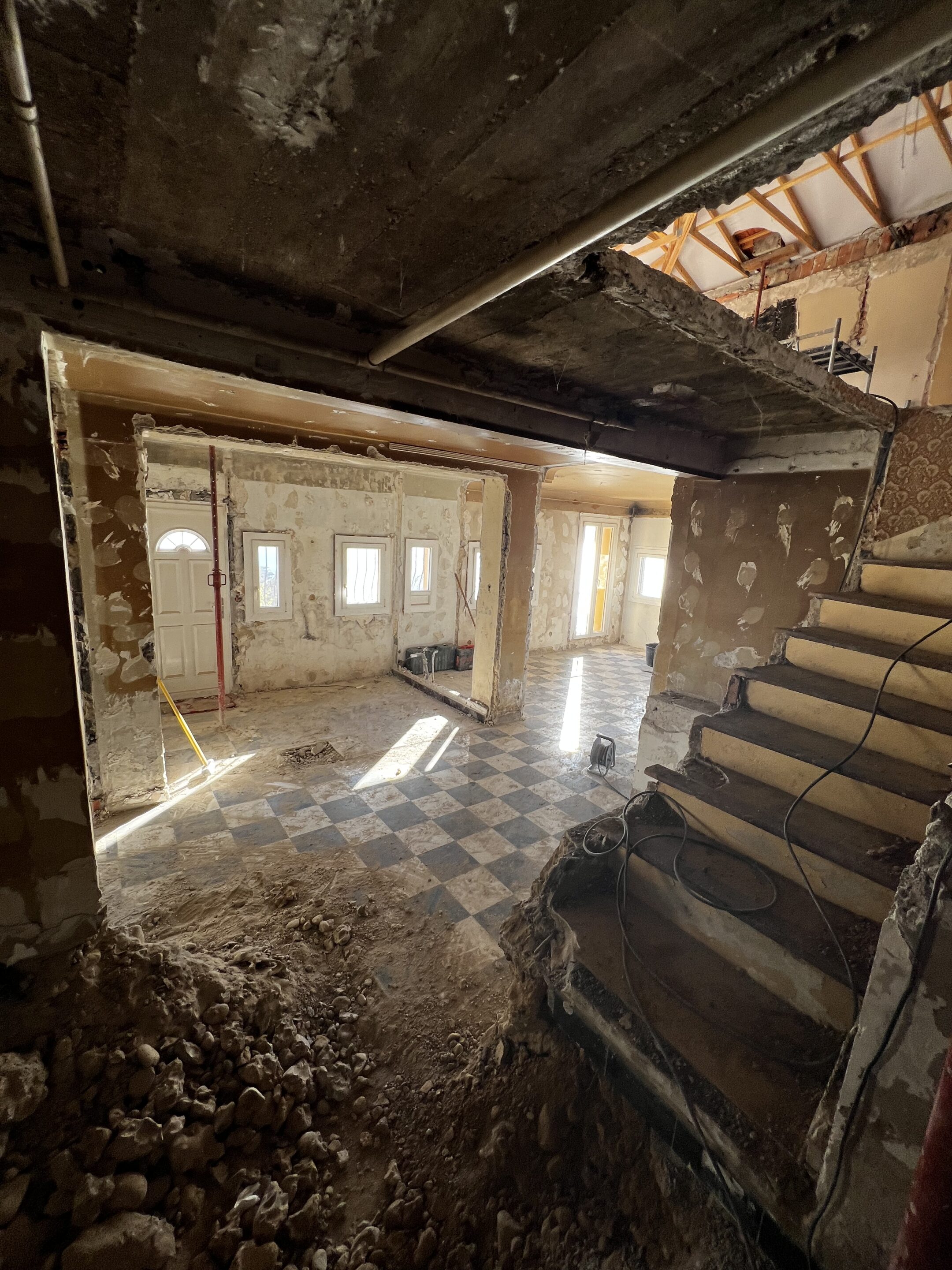 View from the entrance into the living room during the renovation.